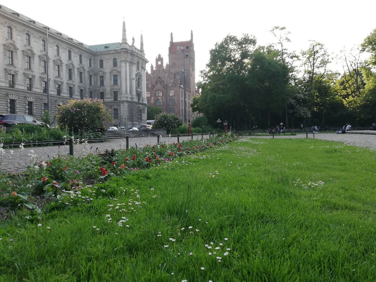 I met my husband after work for a picnic, pretty flowers and grass spots looking onto the fountain, lovely at sunset. It's a popular spot for people to meet for a drink after work. On a main road but the buildings on the other side are grand too look at.