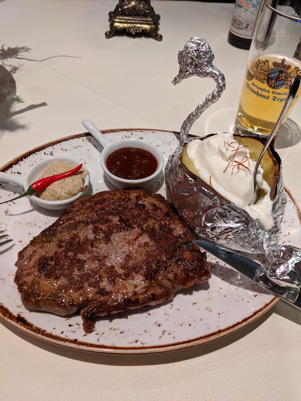 Wonderful meal! One of the best meals I've had in Munich. I had the rib eye steak with corn on cob, baked potato with sour cream and BBQ sauce on the side. Wine was excellent too!