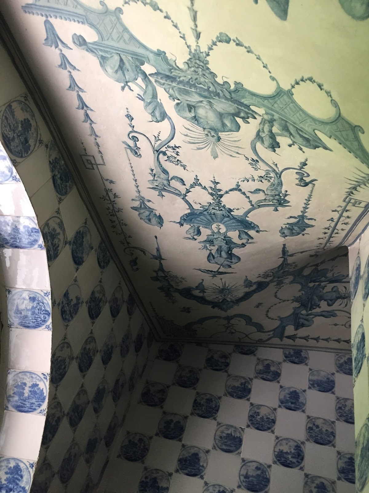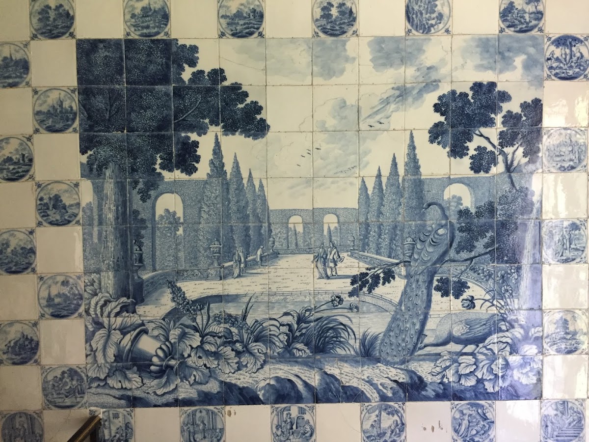 The interior is made of two floors. The ground floor is covered wall to wall, ceiling and floor with Dutch tiles from Delft fashioned in the manner of Chinese style blue-and-white images and scenes. It is stunningly beautiful and photogenic.