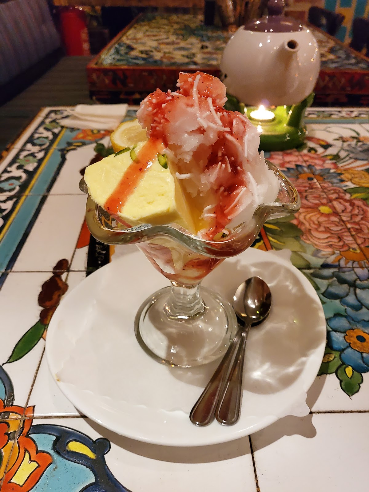 As You enter you realize it's a completely different atmosphere down there, bit of a Persian Alice in wonderland vibe. Beautiful lighting with pictures of Iranian history on the walls. In the dead center of the restaurant there is a slow and tranquil flowing fountain,the entire restaurant Is heavily transformed, which erases all traces of the busy, cold and rainy city above you.