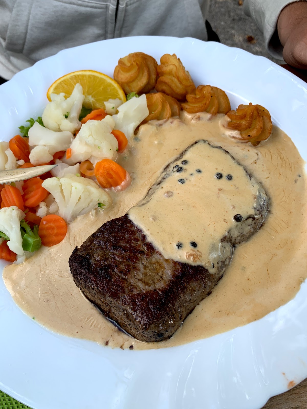 The Wiener schnitzel was great, but the roasr potatos were to die for - delicious! The pfeffer steak was a bit bland for our taste. I liked the place and will come back if Im around - good option if you are spending the day around the lake.