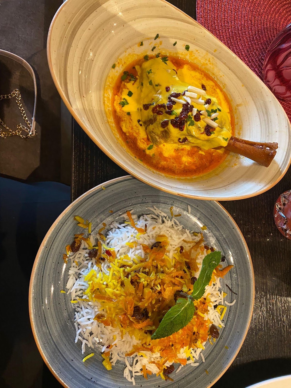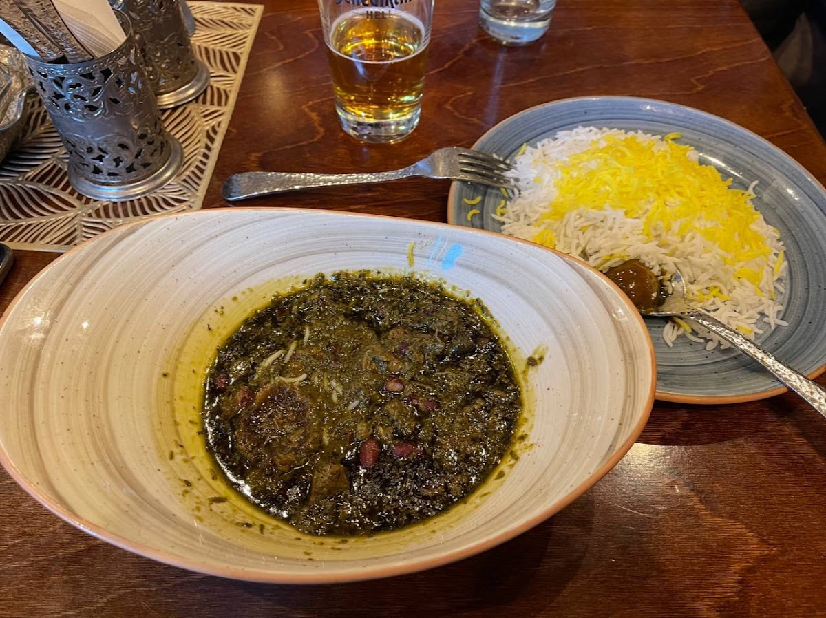 First experience in a Persian restaurant, and I gotta say I liked it. We didn’t exactly know what to expect, so it took us a while to decide what to order. Since we couldn’t choose an appetizer, we went with a mixed plate which contained a small sample of different ones. Falafel, different spreads, and stuffed vine leaves (delicious) with some naan. They were all quite good, but the hummus and eggplant spread both deserve special praise.
