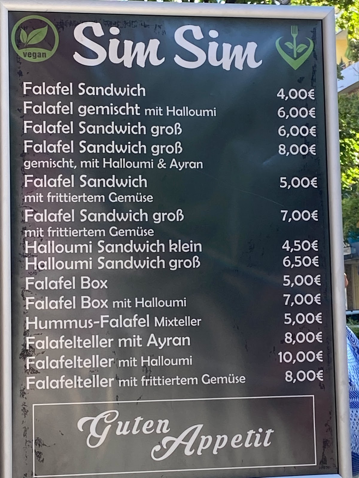 Falafel comes in 3 sizes: regular, groß (recommended when hungry) and jumbo (for people with big appetite, it consists of three pita breads wraped inside each other). The falafel tastes great, one can also add Halloumi or grilled veggies for more taste. The prices are fair.