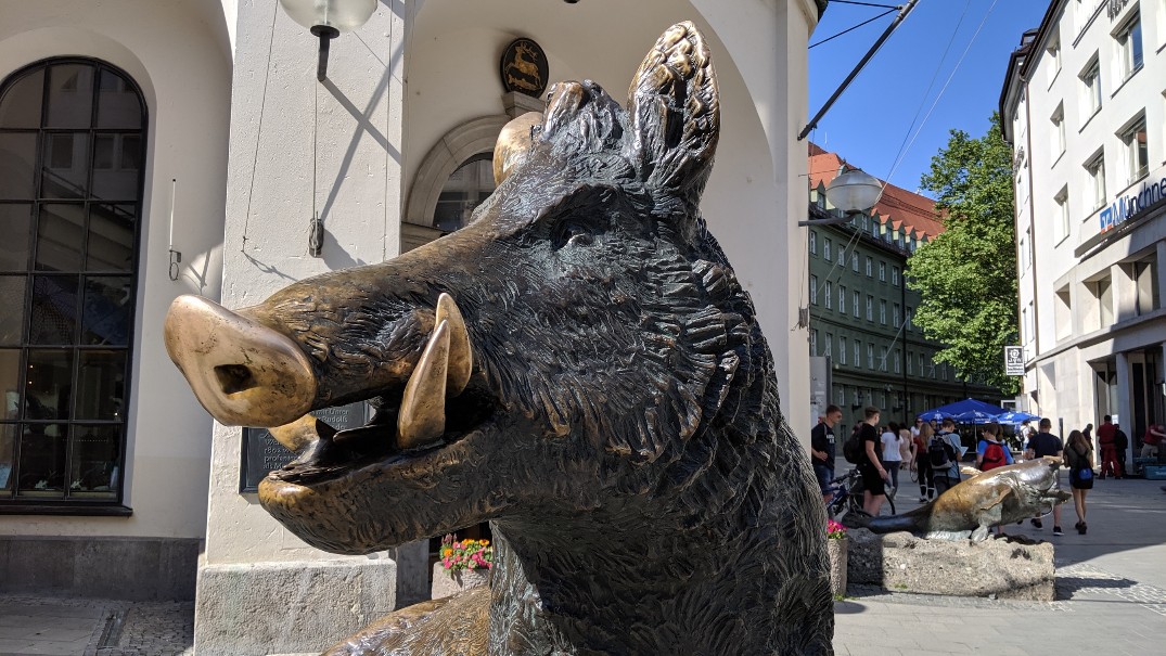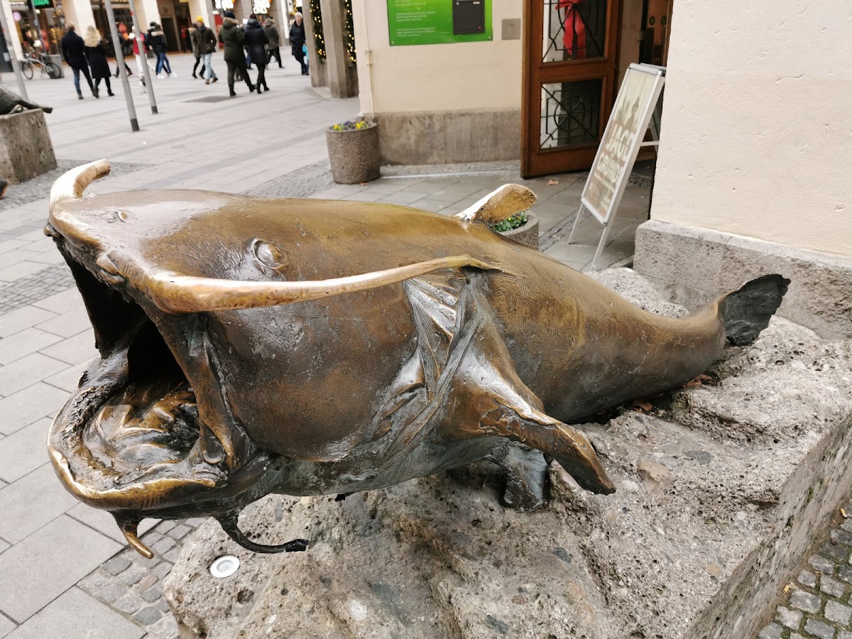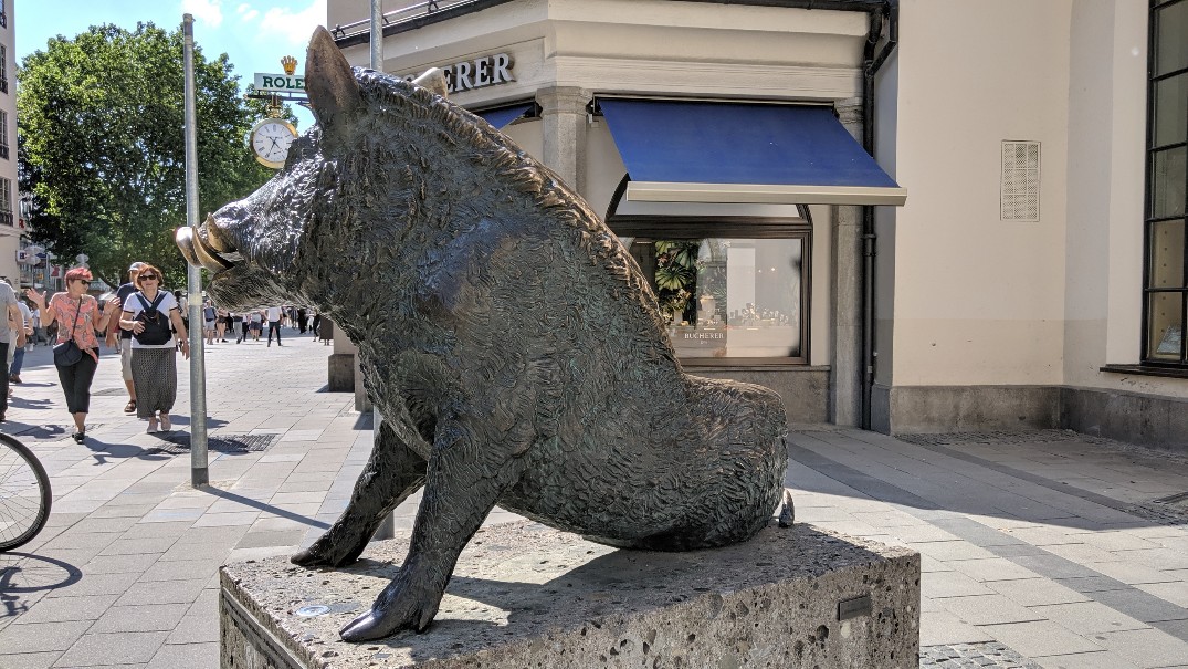 The Sitting boar sculpture is a popular sculpture that sits just outside the German Hunting and Fishing Museum on Neuhauser Strasse. It's another one of those bronze statues that locals and tourists like to rub supposedly for good luck. The "good luck" spot on this sculpture is the snout as evidenced by the shiny snout compared to the rest of the statue.