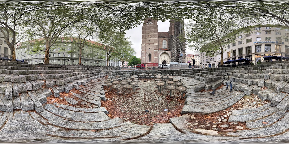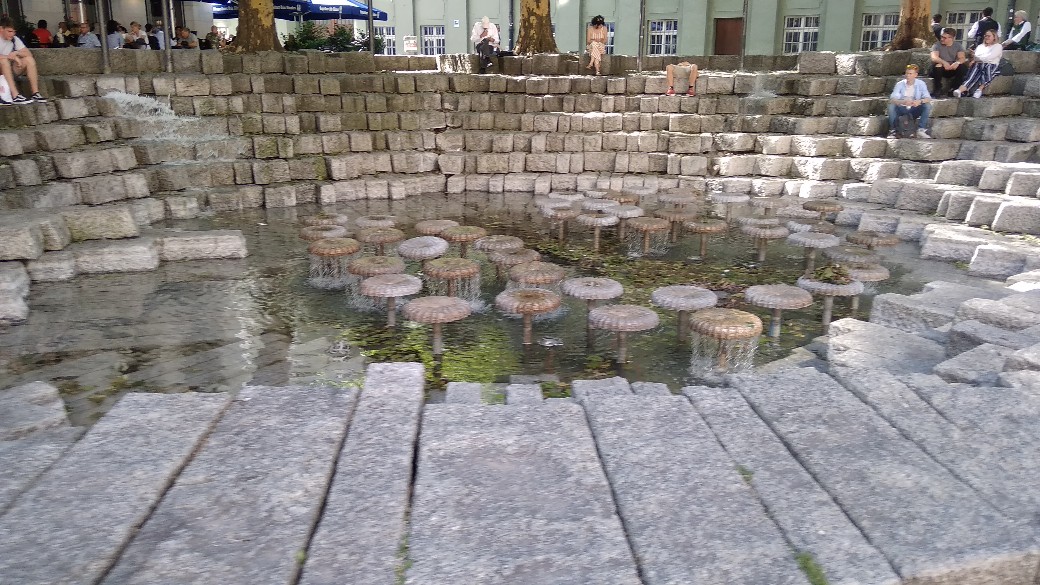 a very relaxing place where mushrooms made of stone are built in an artificial pool with many stones places to sit under the trees just in front Frauenkirche.