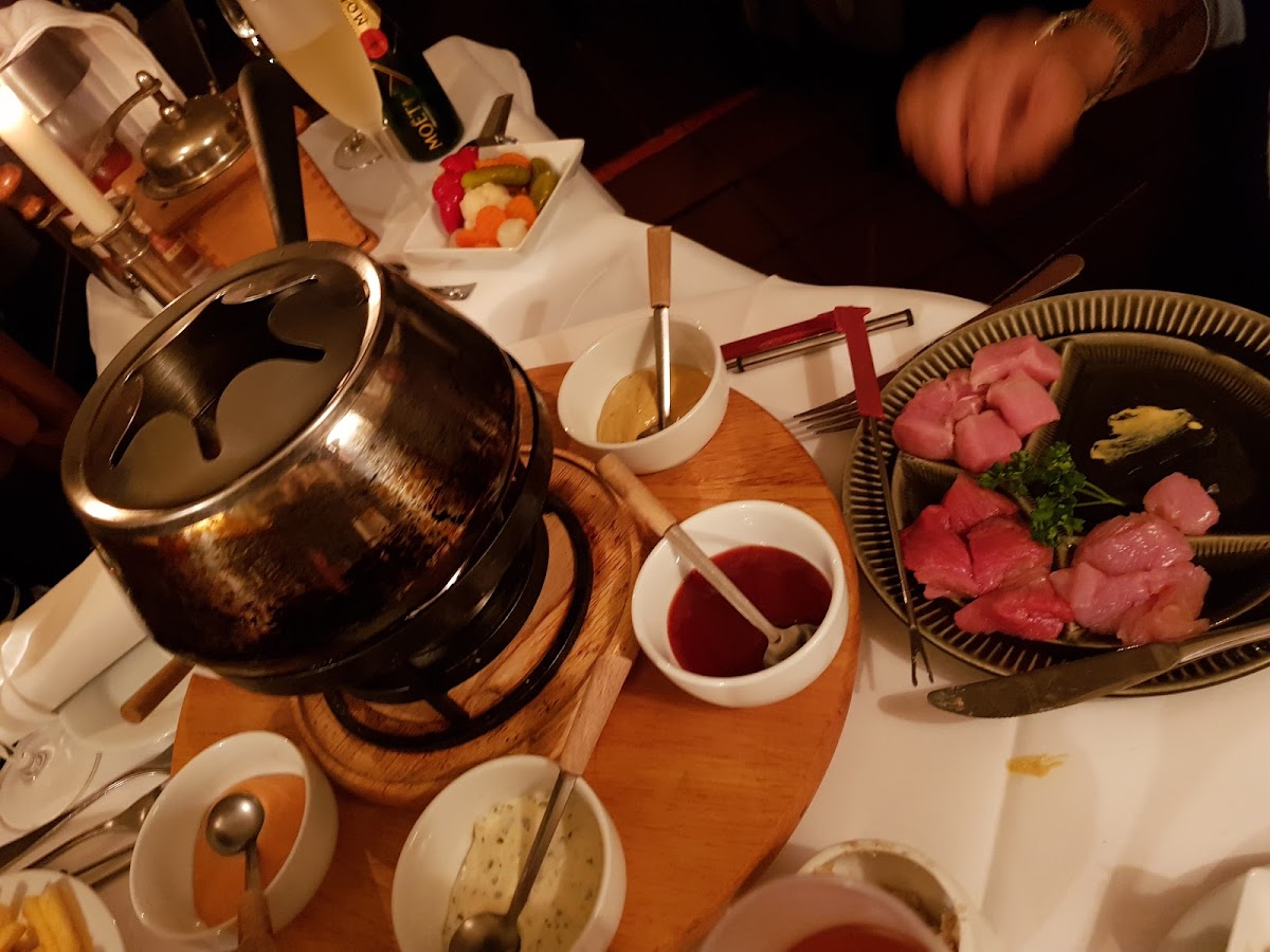 My wife and myself had a wonderful experiance. We tried the potato pancakes with sliced salmon, the meat fondue, and the German classic Beef Rouladen. It was a very cute place with white table cloths and traditional German decor. After a long day of travel it was very nice compared to a noisy beer hall. The staff was very nice and fun which added to the experience.