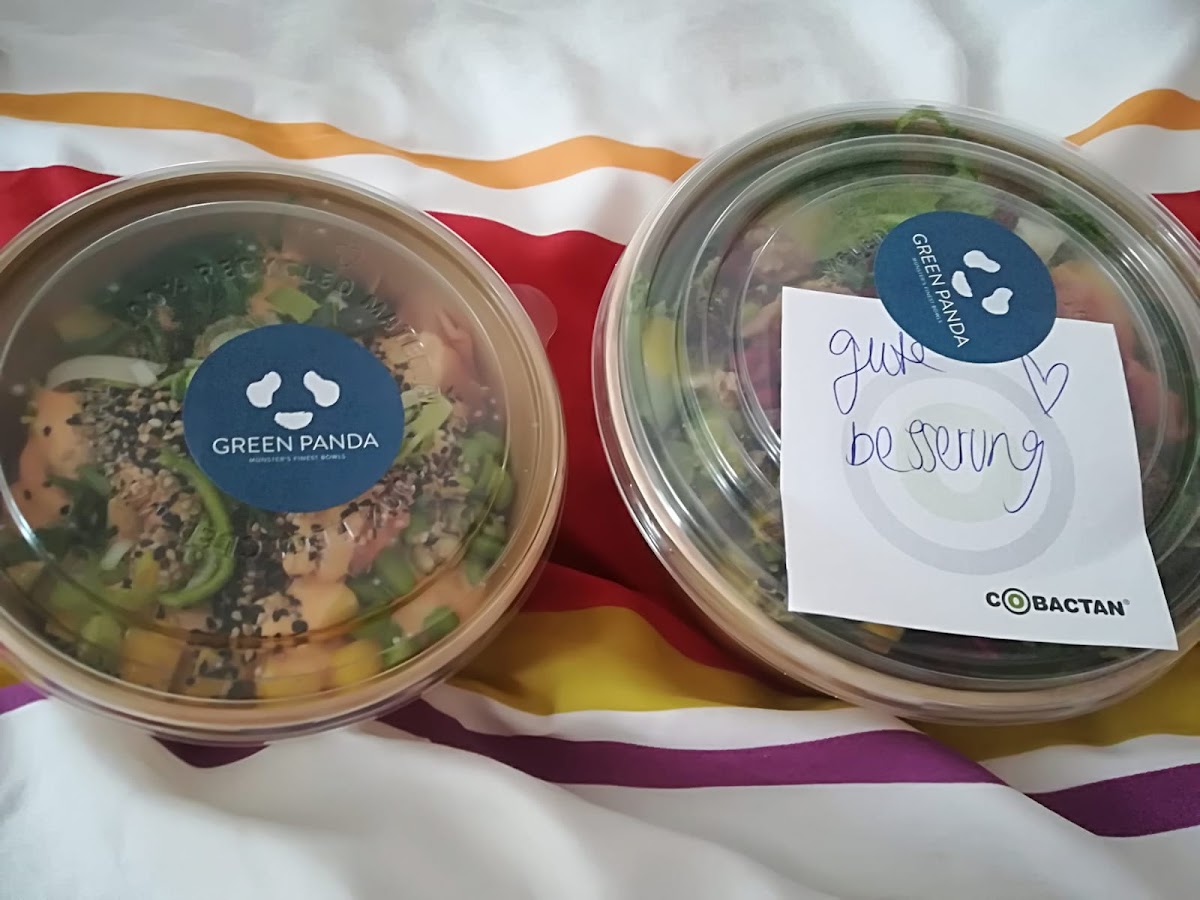 Wir haben uns Bowls und salate liefern lassen, leider mit einer Verspätung von 20 Minuten. Lieferant war aber sehr freundlich.