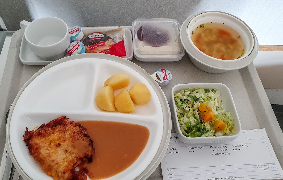 Of course, this helps to get well faster. Not to forget, the food is optimal and tasty. Every day we asked what you wanted. Unfortunately, the muesli and grain rolls fell victim to the austerity program. Only PRIVATE PATIENTS get that.