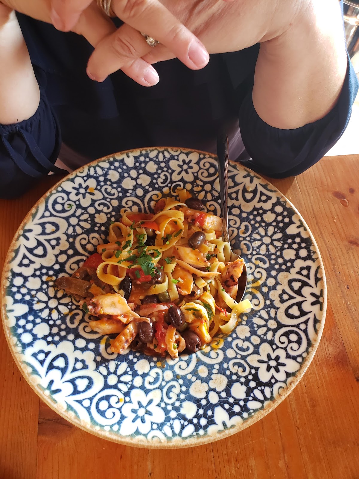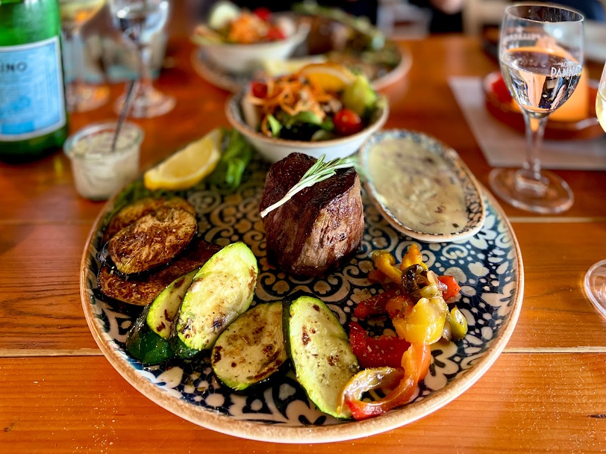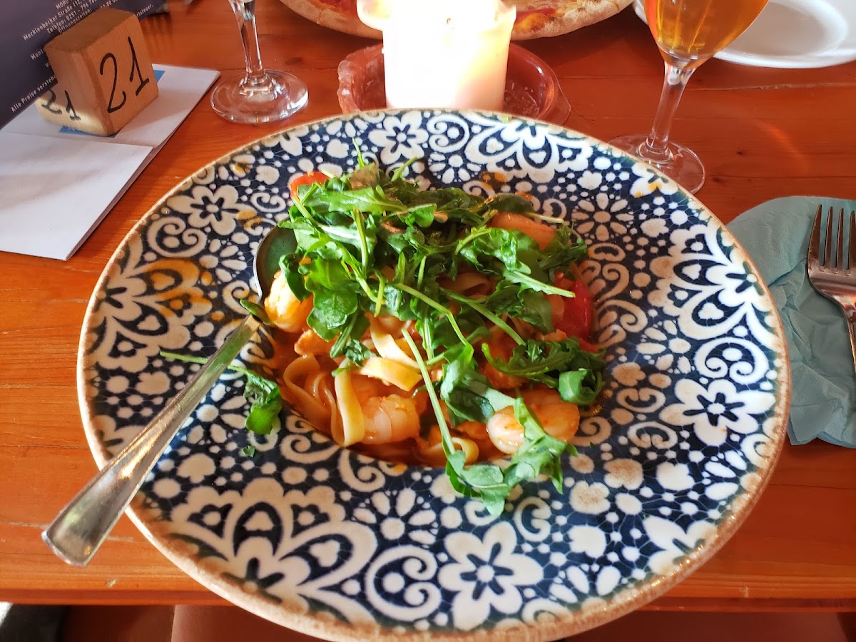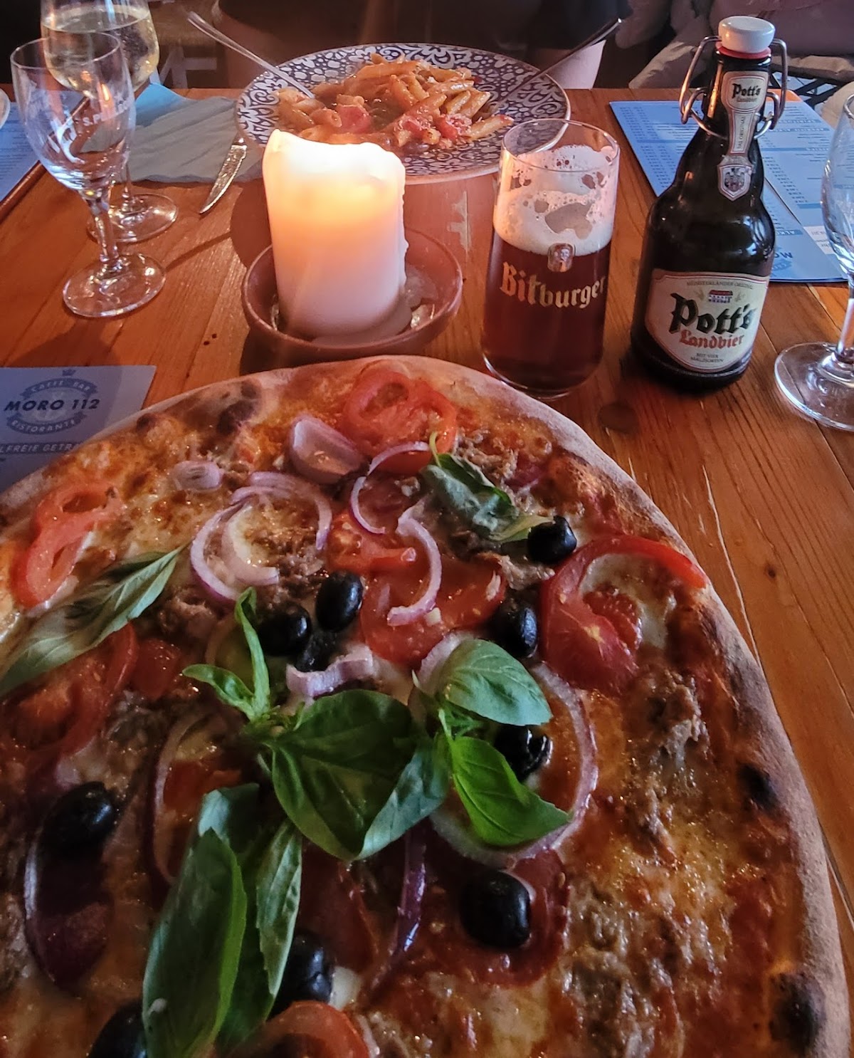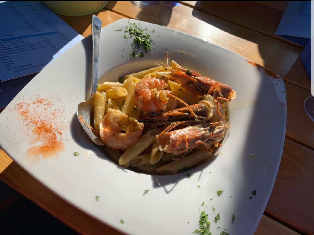 Great place with a vacation vibe right next to the Aasee. They have a beautiful terrace and in indoor dining room that opens all up and even seats right at the Aasee footpath. Very large menu with pizzas and pastas mostly but also a special menu with grilled fish. Prices are reasonable between $14-$30. The place was packed so a must to reserve ahead. The food tasted great. Service was slow at times due to the business but otherwise very friendly and accommodating. We're definitely coming back. Great find.