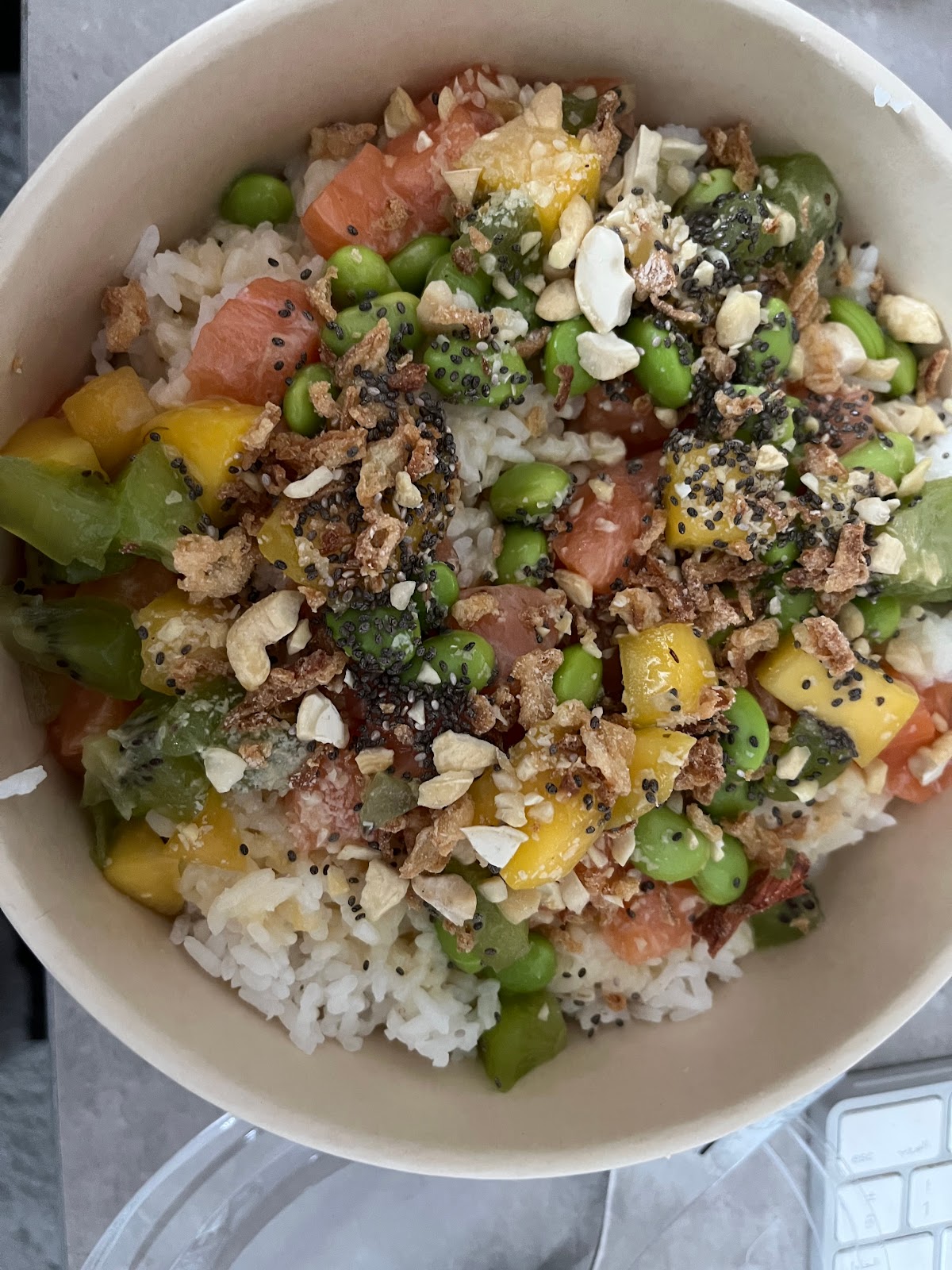 Very good bowl. The fish was tender and fresh, lots of good tastes in the bowl with some great crispiness mixed in. You can make your own bowl or order one designed by the house if you get a little overwhelmed like me. The staff was nice and spoke perfect English.