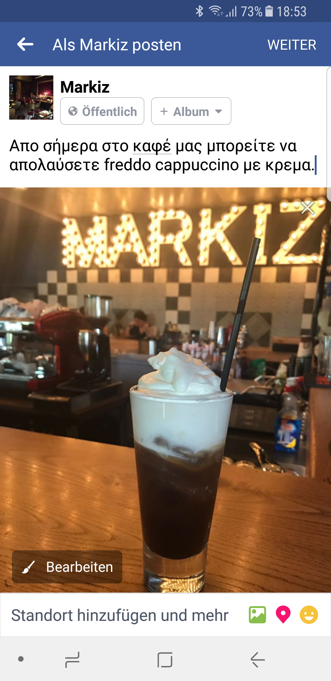 Greek music. Nice people. Good staff. You can find freddo espresso and other cold cafe variants