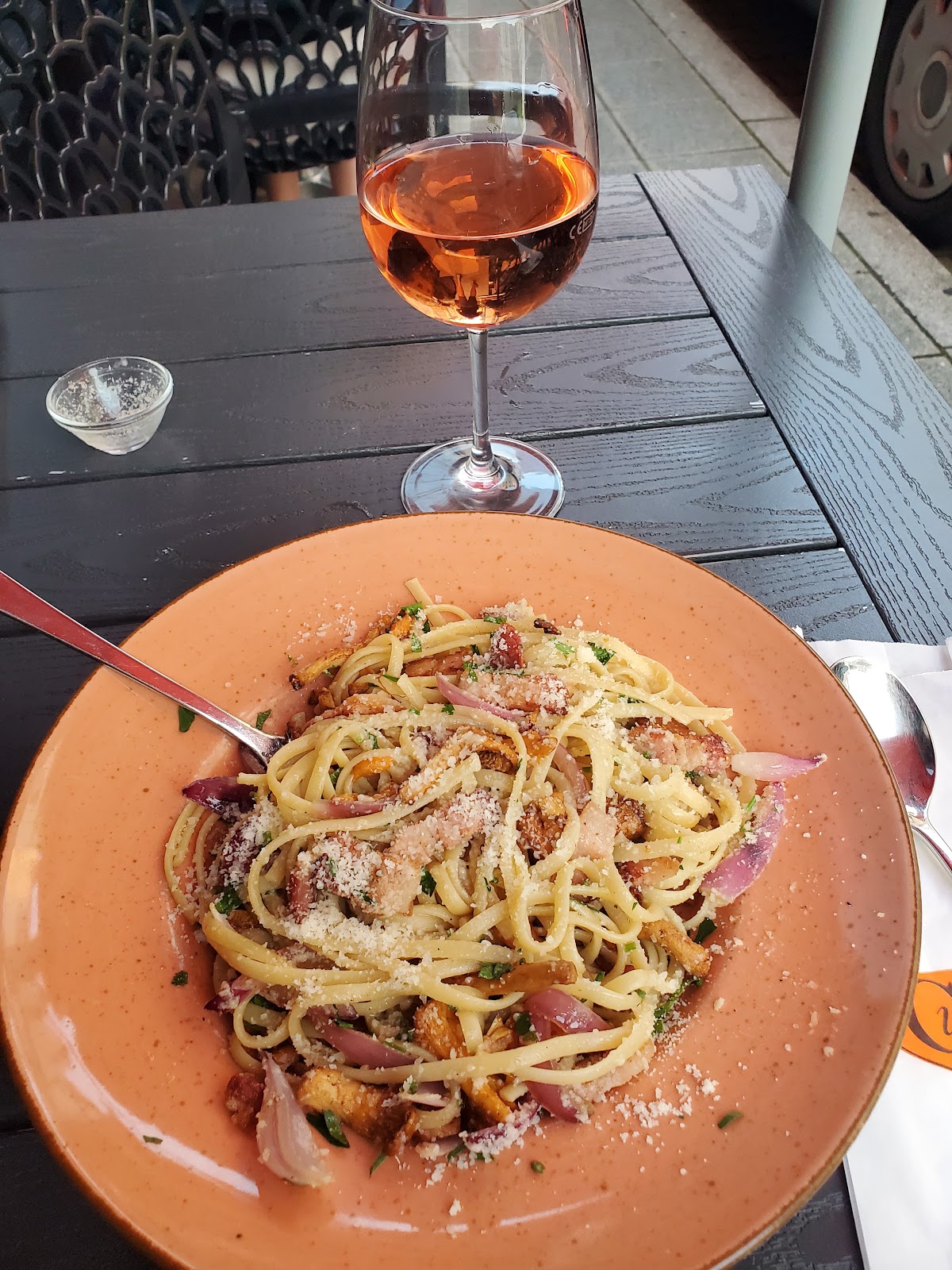 An oasis of calm in the Nuremburg World Music festival this weekend. Food was really tasty, I had the daily special with chanterelles and bacon, great flavor and plenty of chanterelles. Also, the waitress very forgiving when I ordered a bottle rather than a glass of wine (my German's not great) .