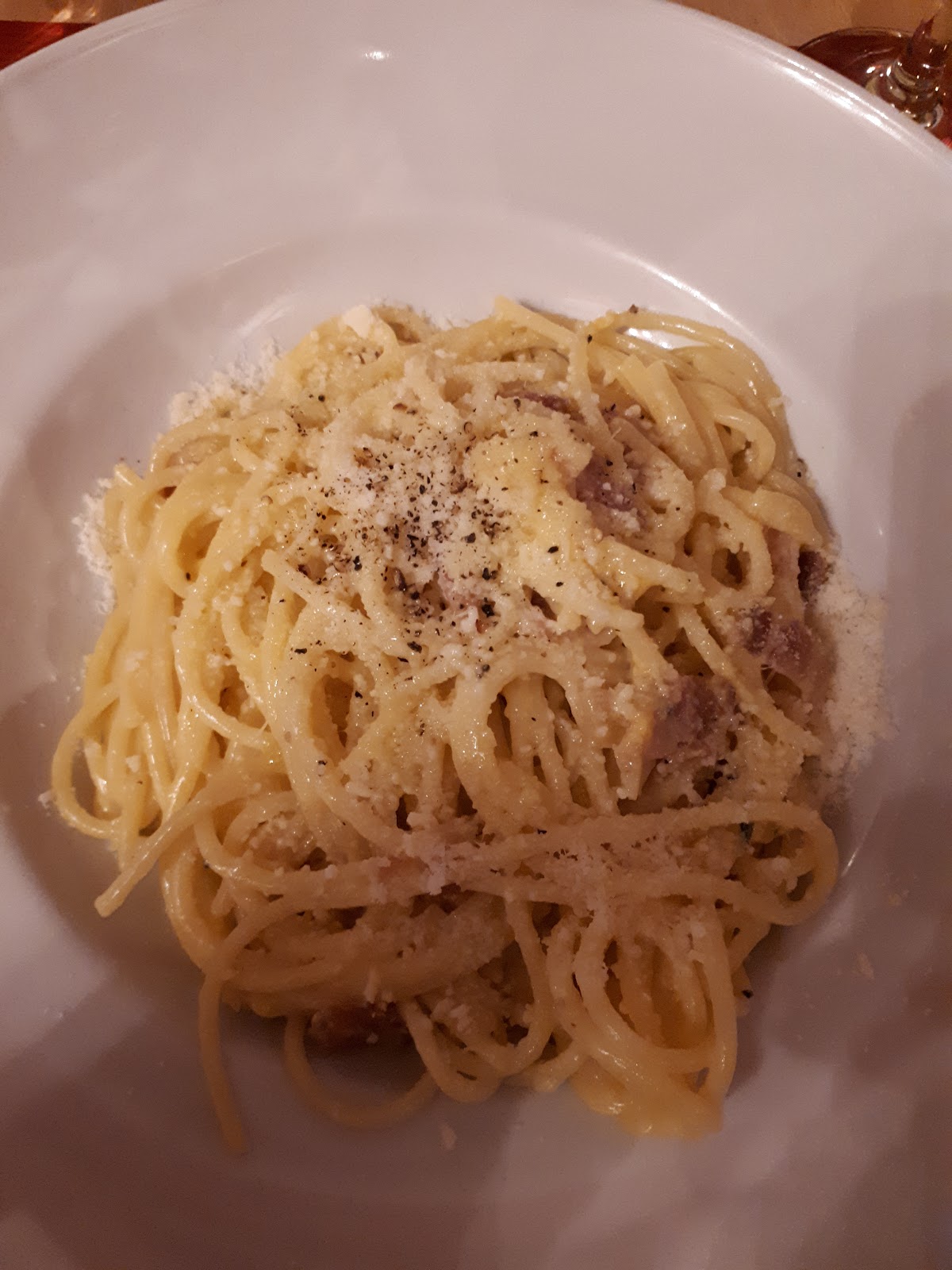 Two stars not for the food itself, but for a couple of details that I didn't like so much... And for this price details make the difference. Antipasti extremely poor (du cose de numero), good bread but few slices (na vorta finito manco a chiede de portà nantro cestino), Carbonara really good, Cacio e Pepe fare away from how it should be (era pasta "oio e pepe", co mpo de cacio non mantecato), dessert tasteless (cassata gelato che nun sapeva ne de me, ne de te), good bottle of wine but arrived at the table already open (portà la bottija aperta ar tavolo nun se fa), waiters often out to smoke and coming back stinky of cigarette (mentre stai in servizio nun se fuma, se propio devi per lo meno l'accortezza de nun tornà dentro che odori de posacenere), not really friendly at the first impact but then goes better (se sa che i clienti so rompicojoni de natura, ma si te rode nun fallo vede appena la gente la fai mette a sede).
