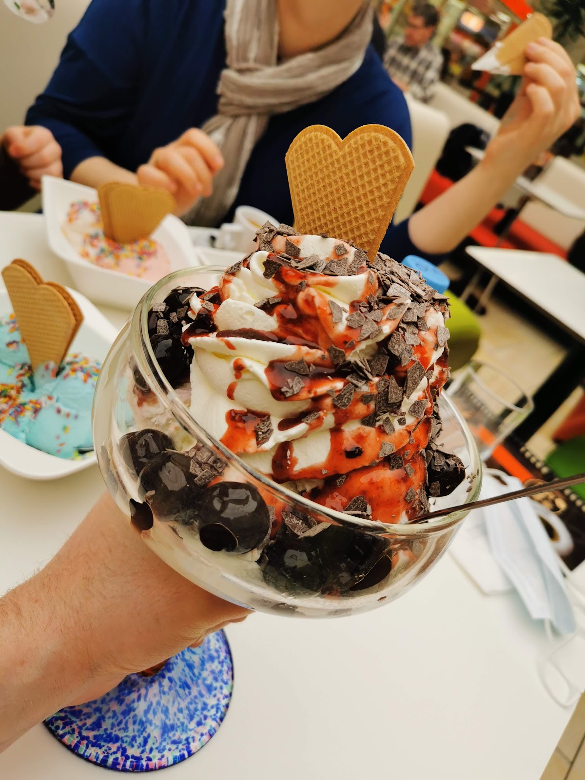 Excellent but quite expensive ice cream, ridiculous surcharge when eating at a table (+€0.30 per scoop). 0.5 liter mineral water for €4.50 (the same bottle at Kaufland costs €0,65) is absurd.