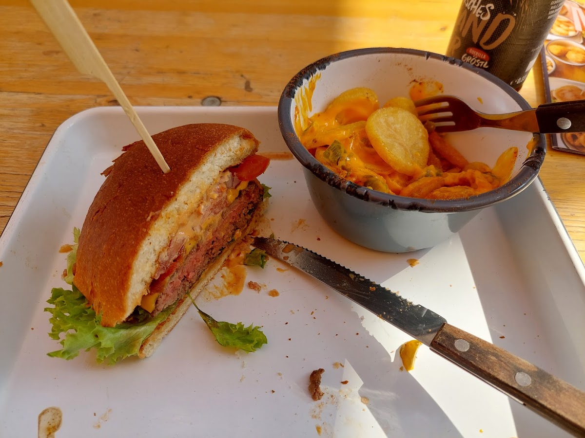 The burger is normal. You can find better burgers in Nürnberg. The service is not nice. The waitress brought us the drinks in a very dirty bottle, and when we complained about it, she responded that Okay, if you want I can clean it, and at the end she did not do it. The other waitress took a plate of food from the table that we were still eating. The sits and table were uncomfortable. The toilet is just unbelievably not hygiene. There was no soap in there (!!). In total, it was not really a nice experience for us.