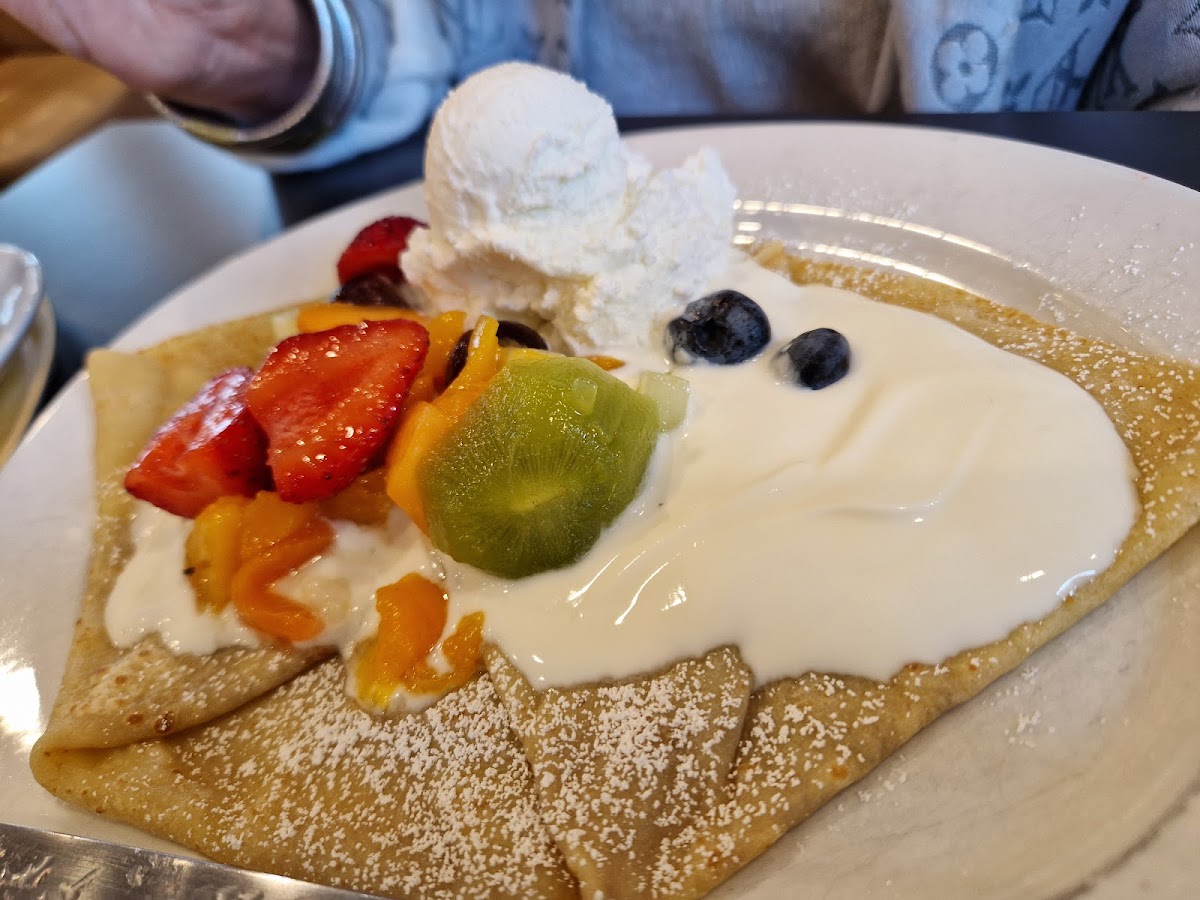 Mediocre "just okay" establishment despite spacious clean corner location with speedy service. Any place that has menus in their menus in their menus already says something to me. LoL. Ingredients inferior and presentation somewhat sloppy with that just thrown together look, whether it be the crepes, drinks, waffles, or what have you. Sure it's a popular sit down spot, but truth be told it could use a lot of polishing up before it begins to even approach "quality". On a hot summer day who cares though, right? That's why this place does well as a volume business and why it likely won't improve beyond "diner" level status.