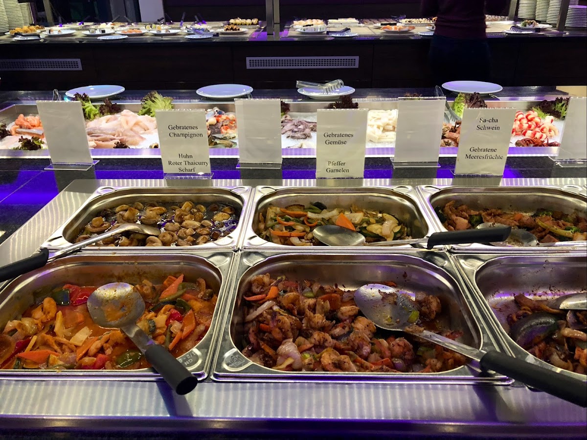 the selection of food is quite underwhelming since we came close to the closing time (our fault). They didn’t top up the sushi selections but it’s understandable. The deco and service is good, drinks very pricey considering the fact that they’re not included into the 18+€ buffet price.
