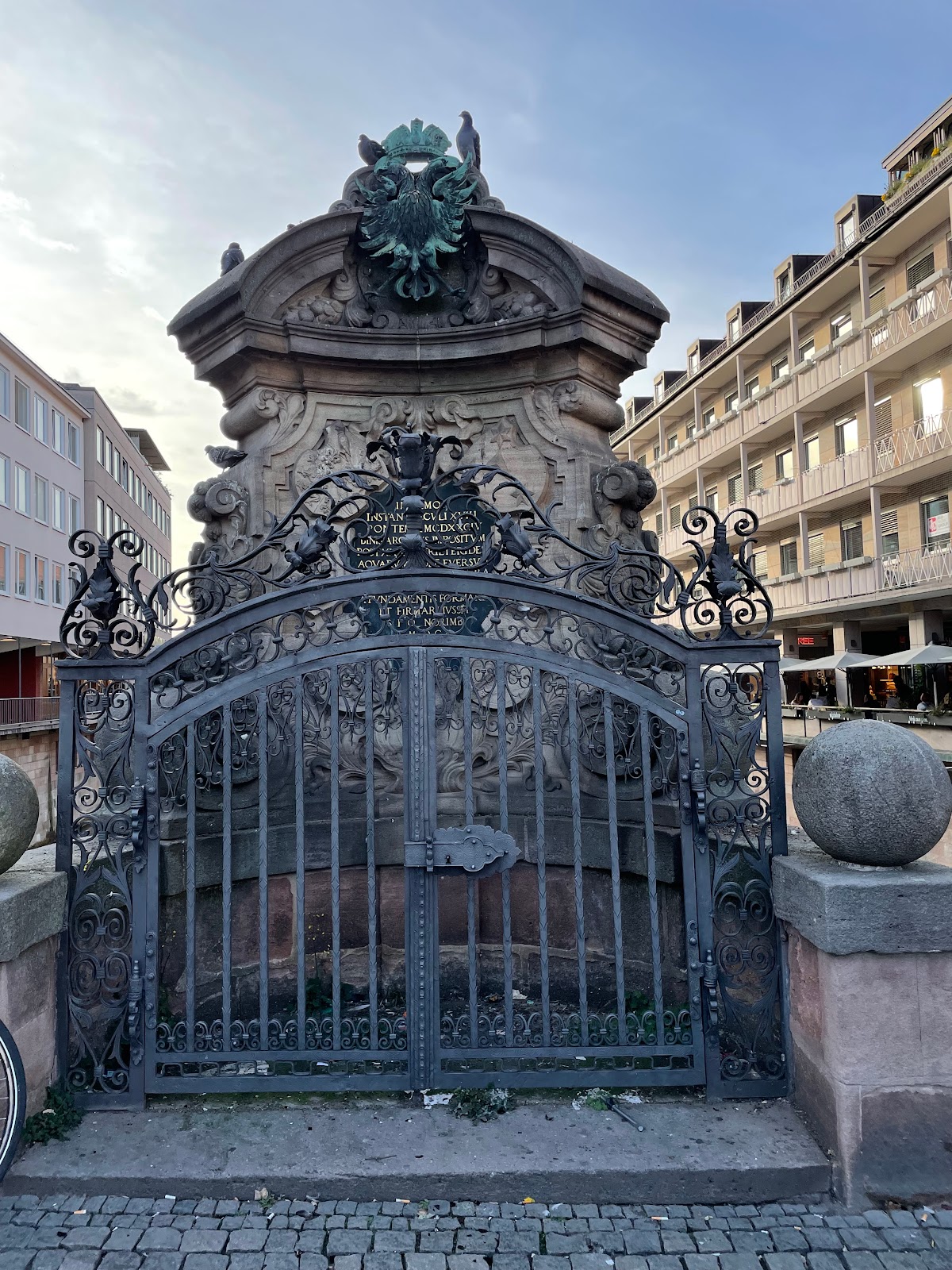 We came across the bridge after passing St. Lorenz Church and just following the road. The bridge was quite interesting with plaques that were gated. There was a plaque on both sides of the bridge with different views. One side had the other bridge and a house with a riverside garden on the other.
