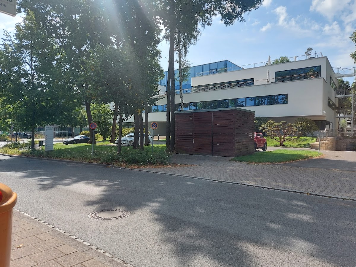 Kleine Haltestelle mit 3 Sitzmöglichkeiten (überdacht) einem Mülleimer und sonst nichts. Neben der Haltestelle ist eine Firmen Ausfahrt mit abgesenkten Gehweg - diese ist praktisch für Rollstuhlfahrer