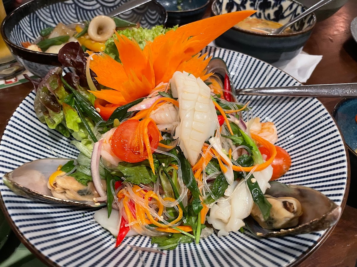 Tom yum (red) soup, morning glory, glass noodles seafood salad are good! Worth the try.