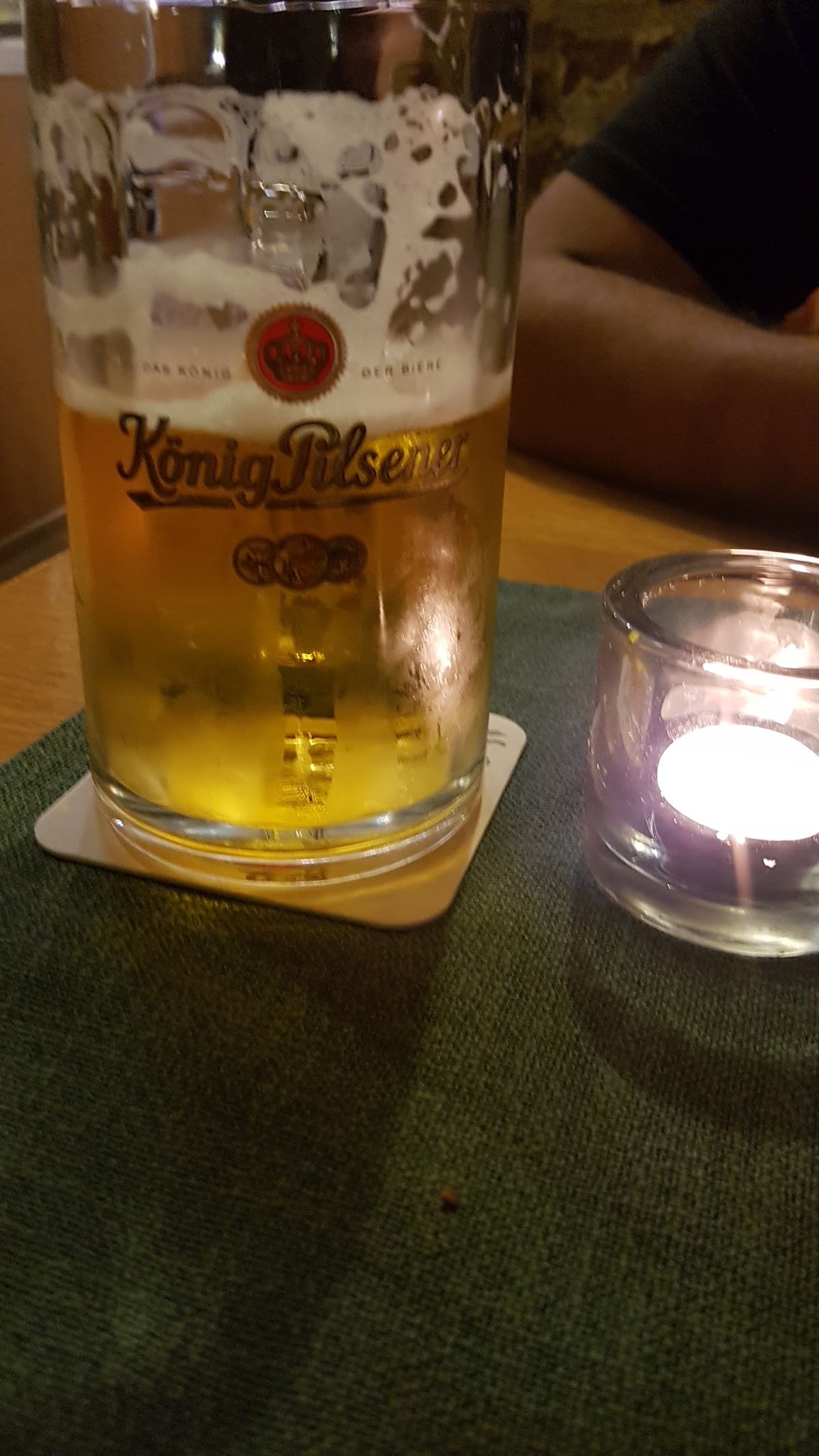 Very nice and tasty food. Vegetarian as well. Cheap and tasty beer. A lot of food coming with salade. Appetizer also nice and big. Very friendly for dog place. At the entrance they offers dog water bowl. Underground very chill place