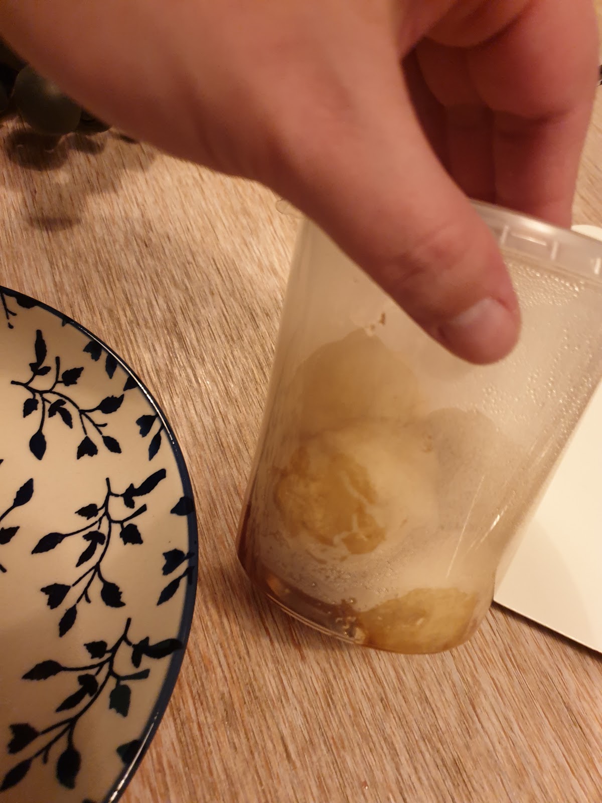 The baked banana came in a plastic cup ... this plastic is an absolute no-go in gastronomy !!