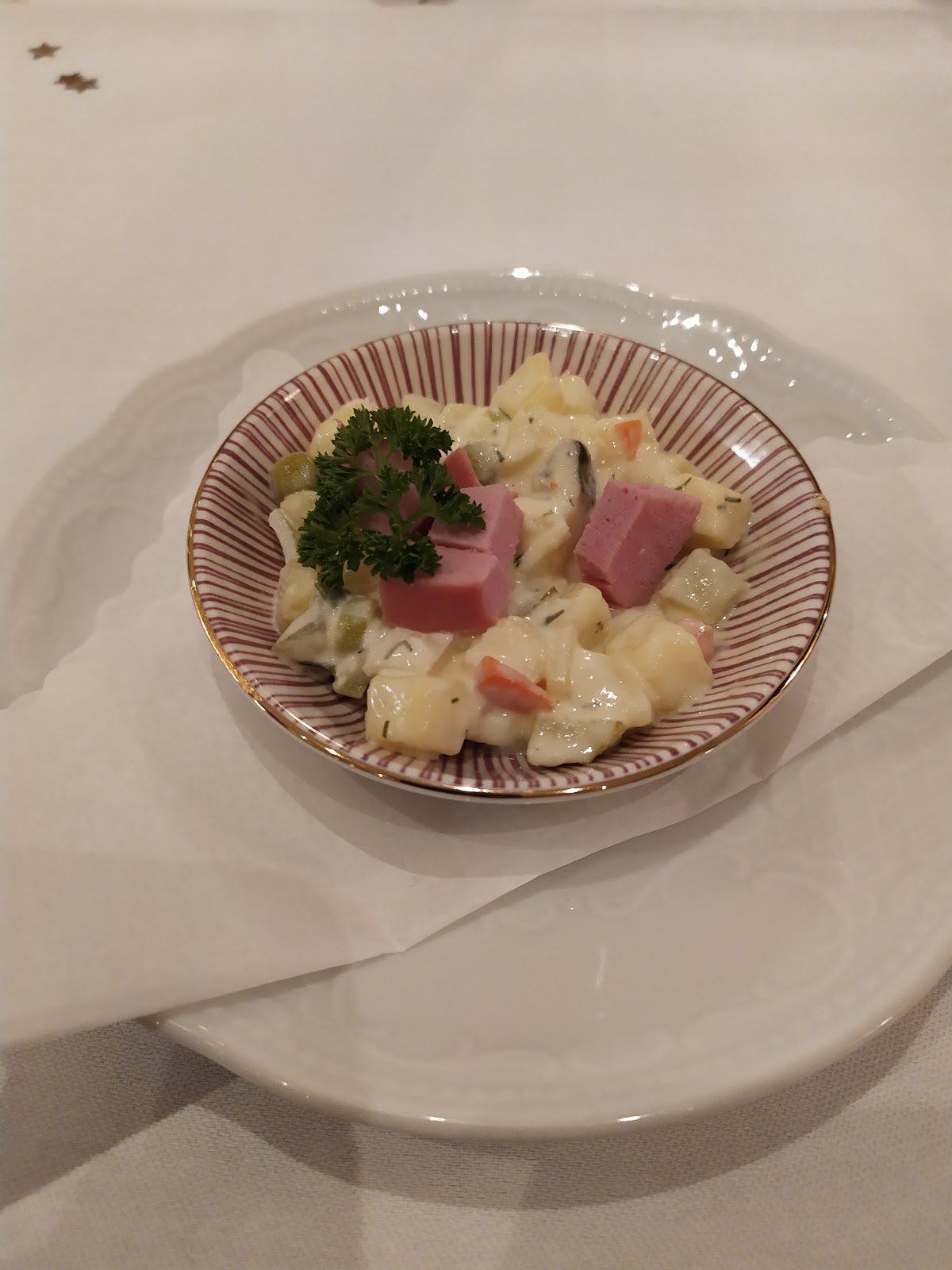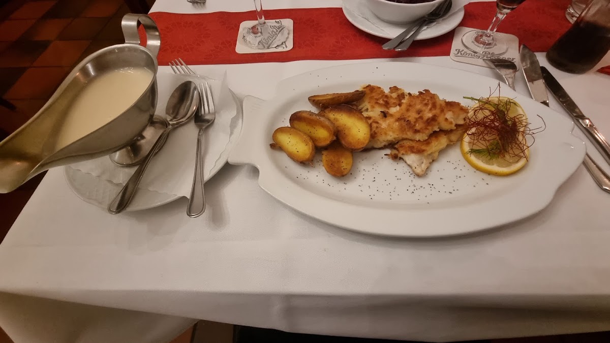 Die erste Vorspeise war zwar lecker, aber sehr klein. Fairer Weise muss man jedoch sagen, dass es noch einen Salat, als zweite Vorspeise gab, der mit einem sehr außergewöhnlichen Dressing geliefert wurde, welches aber lecker war. Die Essensportionen waren recht klein und Beilagen, sowie Soßen wurden von den Kellnern/-innen persönlich auf den Teller gelegt, was einen sehr noblen Eindruck gemacht hat. Das Wiener Schnitzel war nicht golden, was man bei dem Preis und der Aufmachung erwarten könnte. Die Röstkartoffeln, welche am Anfang nicht auf dem Teller waren, waren an einigen Stellen gekocht und an anderen verbrannt. Und somit machte auch der gelieferte Teller einen sehr unansprechenden und leeren Eindruck gemacht hat. Erst auf Nachfrage erhielten wir eine zweite Portion an Kartoffeln.