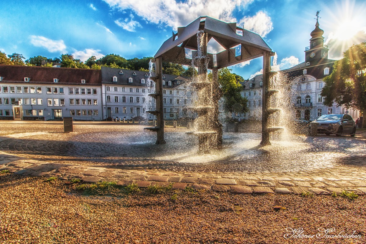 Der Schlossbrunnen steht am Platz des ehemaligen Wachhäuschen, ca. 4 Meter hoher Brunnen mit Kaskaden. Die Sandsteinfigur ist eine Hommage an Stengel und stammt von der Aussenfassade der von Stengel entworfenen Ludwigskirche. Die stark verwitterte Figur mit dem Buch unter dem Arm stellt den Apostel Paulus dar. Die Figur symbolisiert den Schlosswächter. Zu Stengels Zeiten stand der Schlossbrunnen an der äusserten Platzecke vor dem alten Rathaus. An ihn erinnert heute ein gemauertes Brunnenbecken mit einer Kegelabdeckung. Weitere Springbrunnen gab es im Barockgarten hinter dem Schloss, der nicht mehr in seiner Ursprungsgrösse virhanden ist.