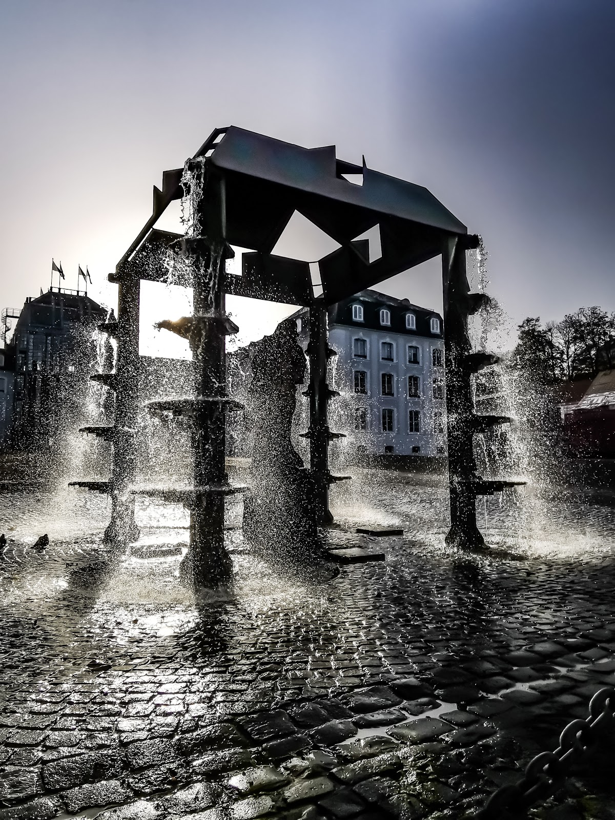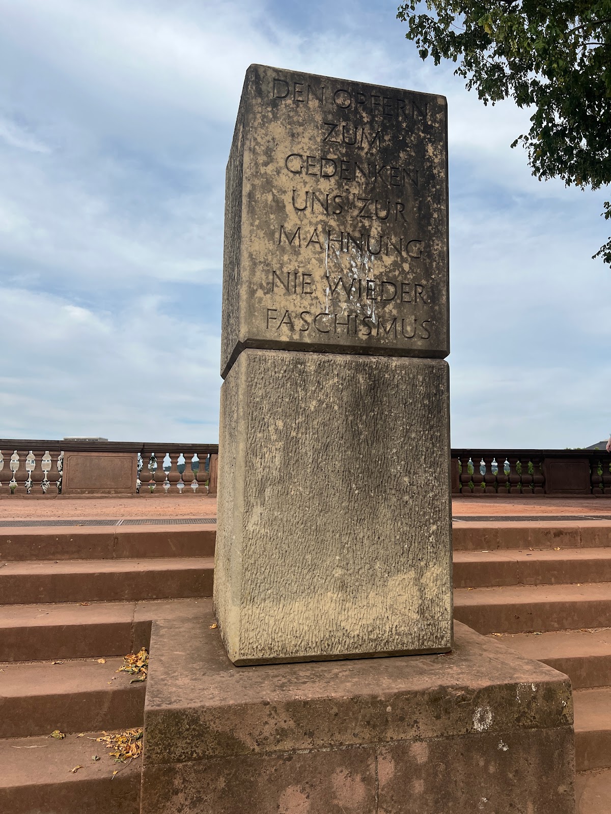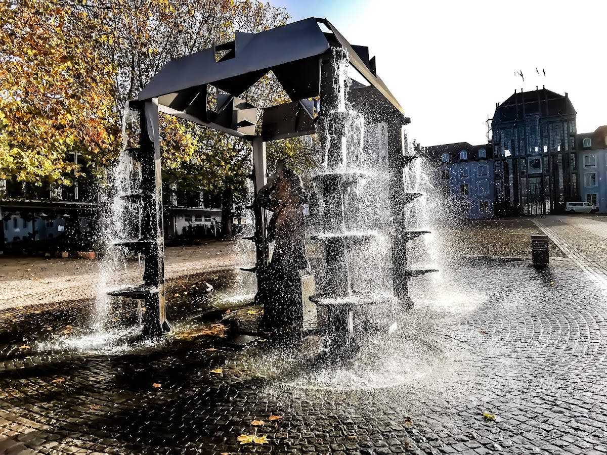 (Translated by Google) The castle fountain is on the site of the former guard house, ca. 4 meters high fountain with cascades. The sandstone figure is a homage to Stengel and comes from the outer facade of the Ludwigskirche designed by Stengel. The badly weathered figure with the book under his arm represents the apostle Paul. The figure symbolizes the castle guard. In Stengel's time, the palace fountain stood on the outer corner of the square in front of the old town hall. A brick fountain basin with a cone cover reminds of him today. There were other fountains in the baroque garden behind the castle, which is no longer in its original size.