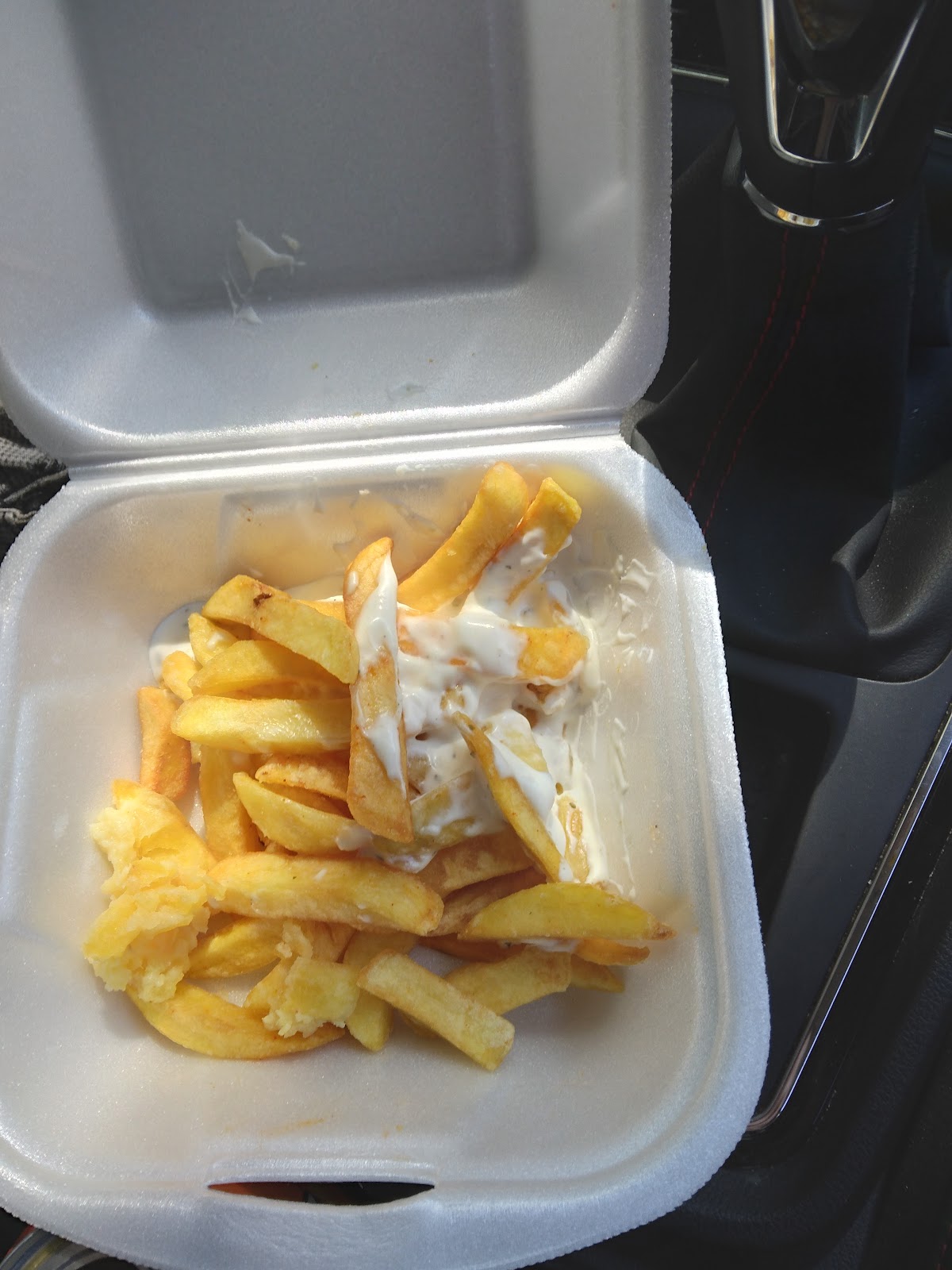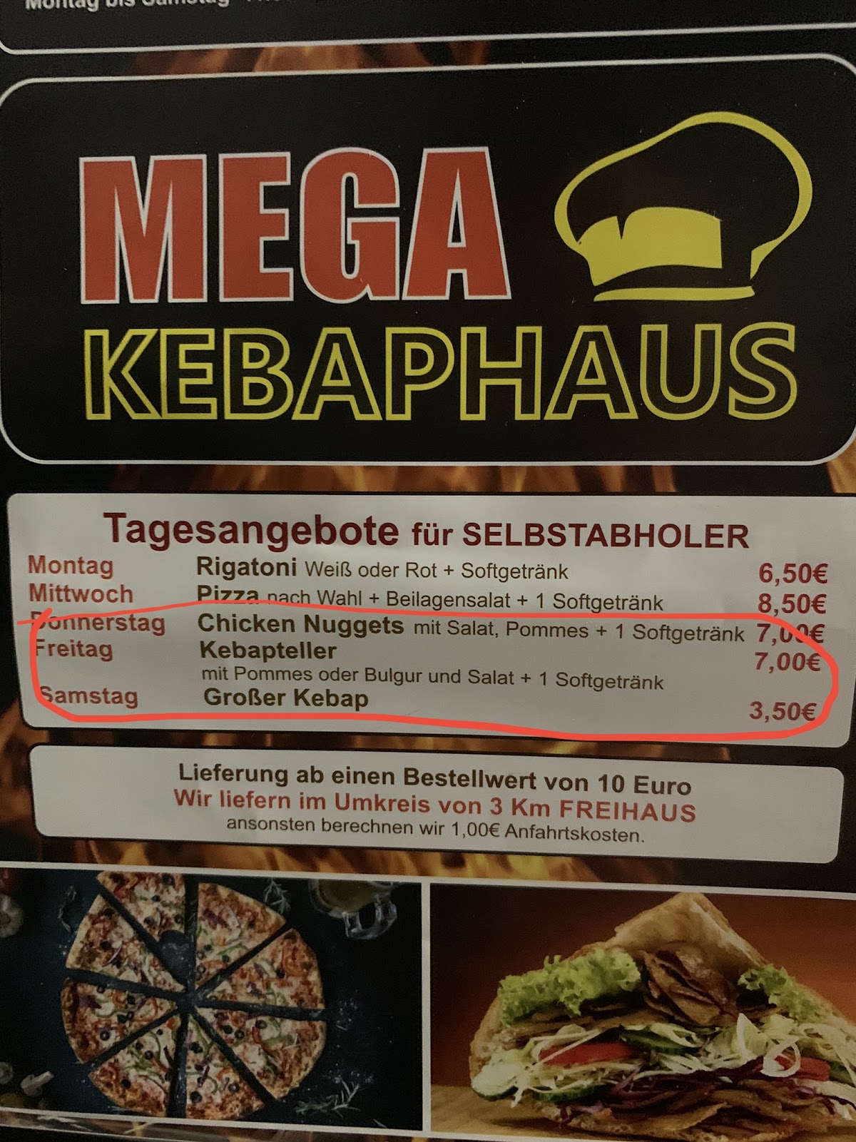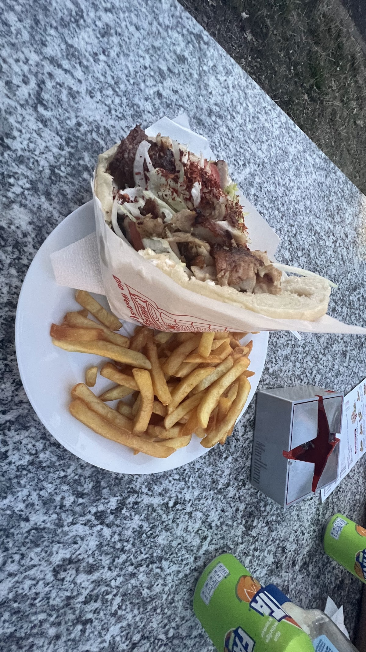 Absolutely fantastic imbiss take away. In Saarbrucken. Freshly cooked lovely fresh salad friendly young man. I had a Schnitzel with French Fry's and salad. Klaus had a Kebap plate salad and rice. I had a free Turkish Ayran and Klaus had Fanta. Great place. Very clean.