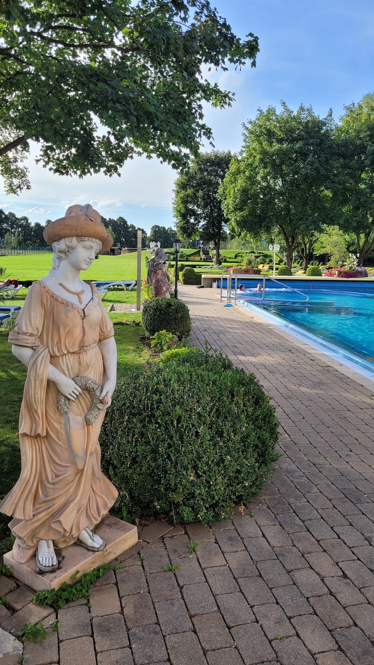 -All decorations within the spa are incredible, starting from some of the columns covered with crystals, others made of pink, white marble. Chandeliers of fine glass work with beautiful blue colored gems, fantastic work on the staircase leading to the topper floors made of thick veiny marble. Beautiful paintings around, I was studying some for sometime. Innovative ideas for therapies in the saunas, using crystals of eucalyptus and menthol directly on the hot stones, freeing up your upper respiratory system. Salt scrubs and mud baths. Pools are available outside too and they are warm so you can relax and bathe even during the winter while snow is falling atop your head. All sauna rooms and Turkish baths are kept tidy, sanitized and clean, with beautiful decorations on the inside (they are named after the king Ludwig II and other important personalities of the time, so you'll find portraits of Cavaliers and coat of arms).