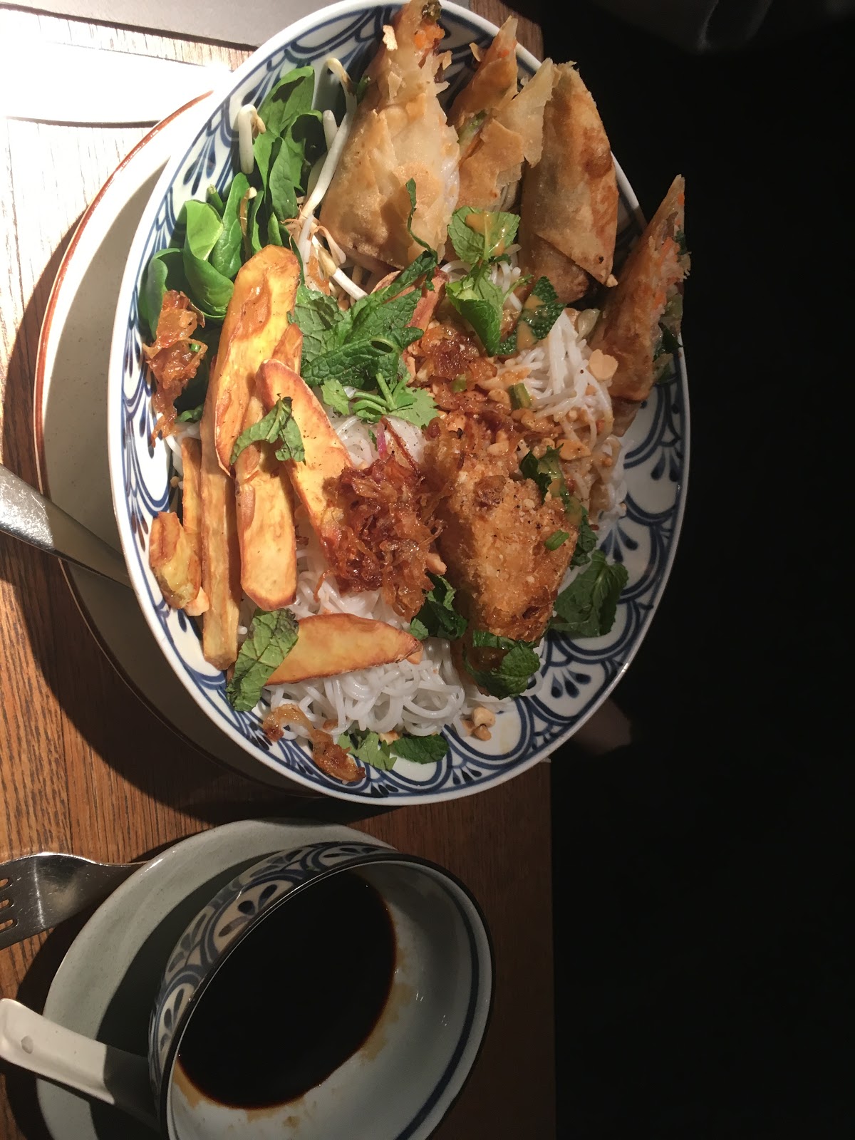 In my opinion not good quality or authentic Asian food. They had run out of Pho by 20:30. The components of my dish didn’t fit together well and lacked flavor. The salmon was deep fried I think and very dry. The chicken in the springroll tasted like the cheapest precooked chicken you can find in the supermarket. The service was good and the location/atmosphere were also nice. Unfortunately the food was very disappointing to me and tbh that’s most important.