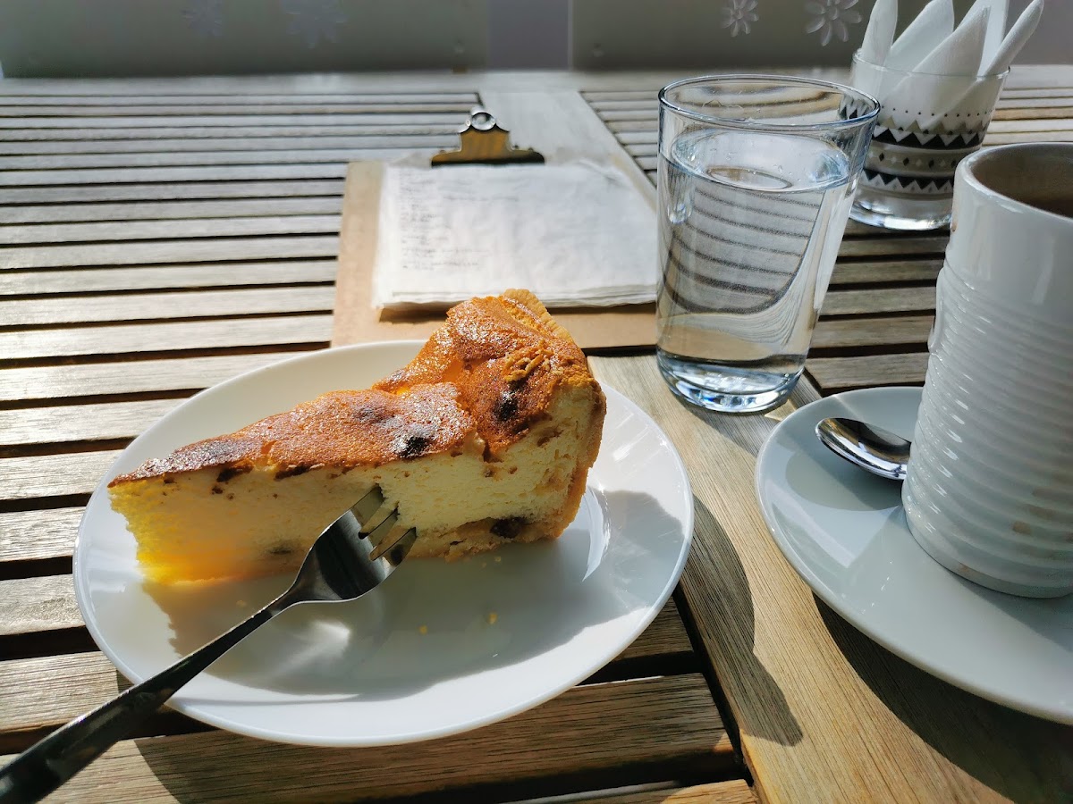 (Translated by Google) Such a cozy, pretty café, you really don't find that on every corner. Discovered by chance while walking and excited about the open door, I walked in curiously and was immediately positively surprised by the nice atmosphere. And then when I looked at the cake counter there was no turning back. I took two pieces of cake right away... the best cheesecake I've eaten so far super mega juicy! And a slice of vegan plum cake.