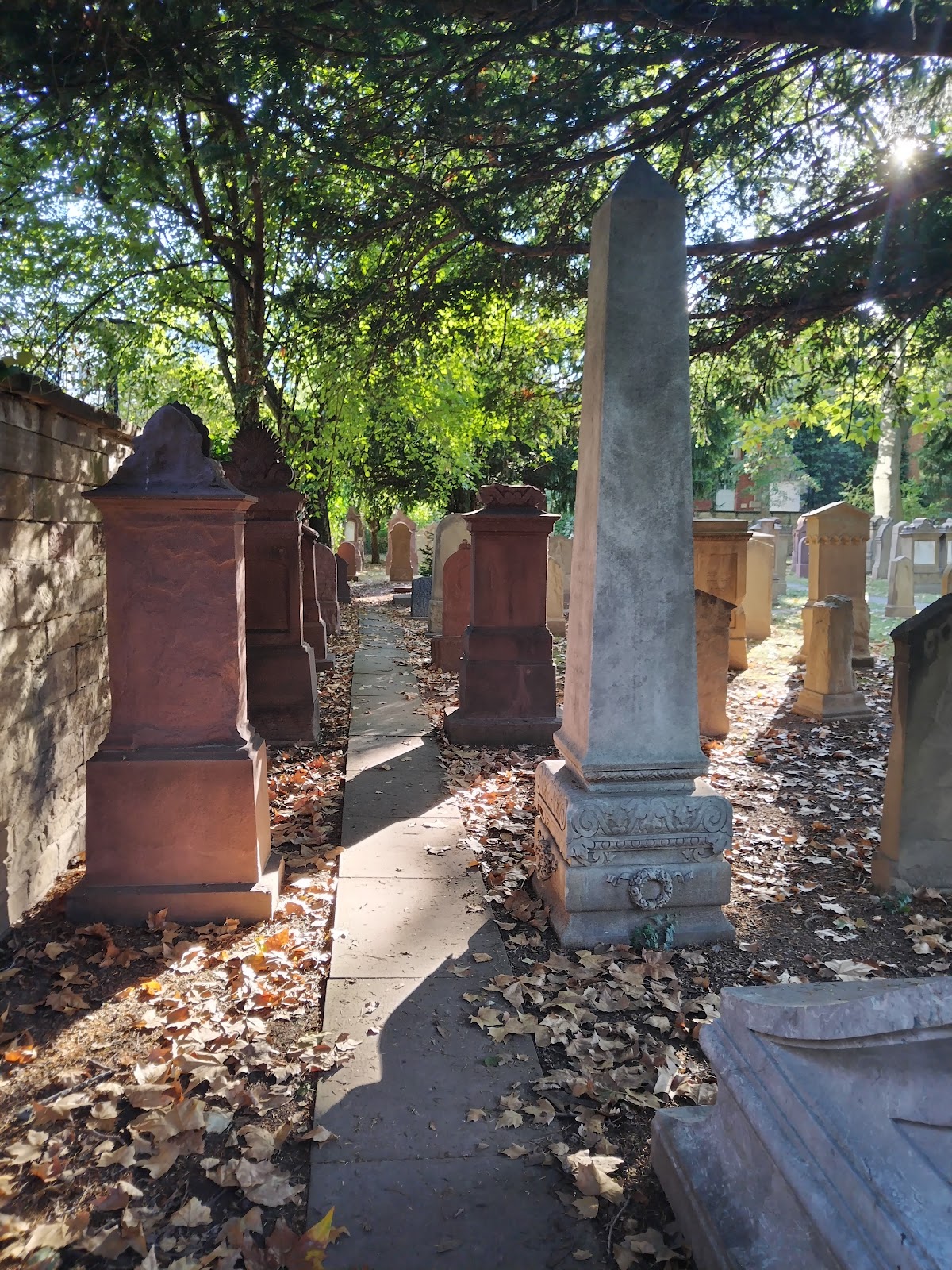 Established in 1626, this was an original Jewish burial ground. Now however it serves as a "Park Cemetery" with many folks enjoying its tranquility and rustic charm, unique to such inner city special places. Fascinating old artistically engraved tombstones and elegant weather faded grave statues.Trees contribute their own seasonal beauty, especially in Autumn when a rustling carpet of deep orange fallen leaves creates a romantic pre winter ambiance.