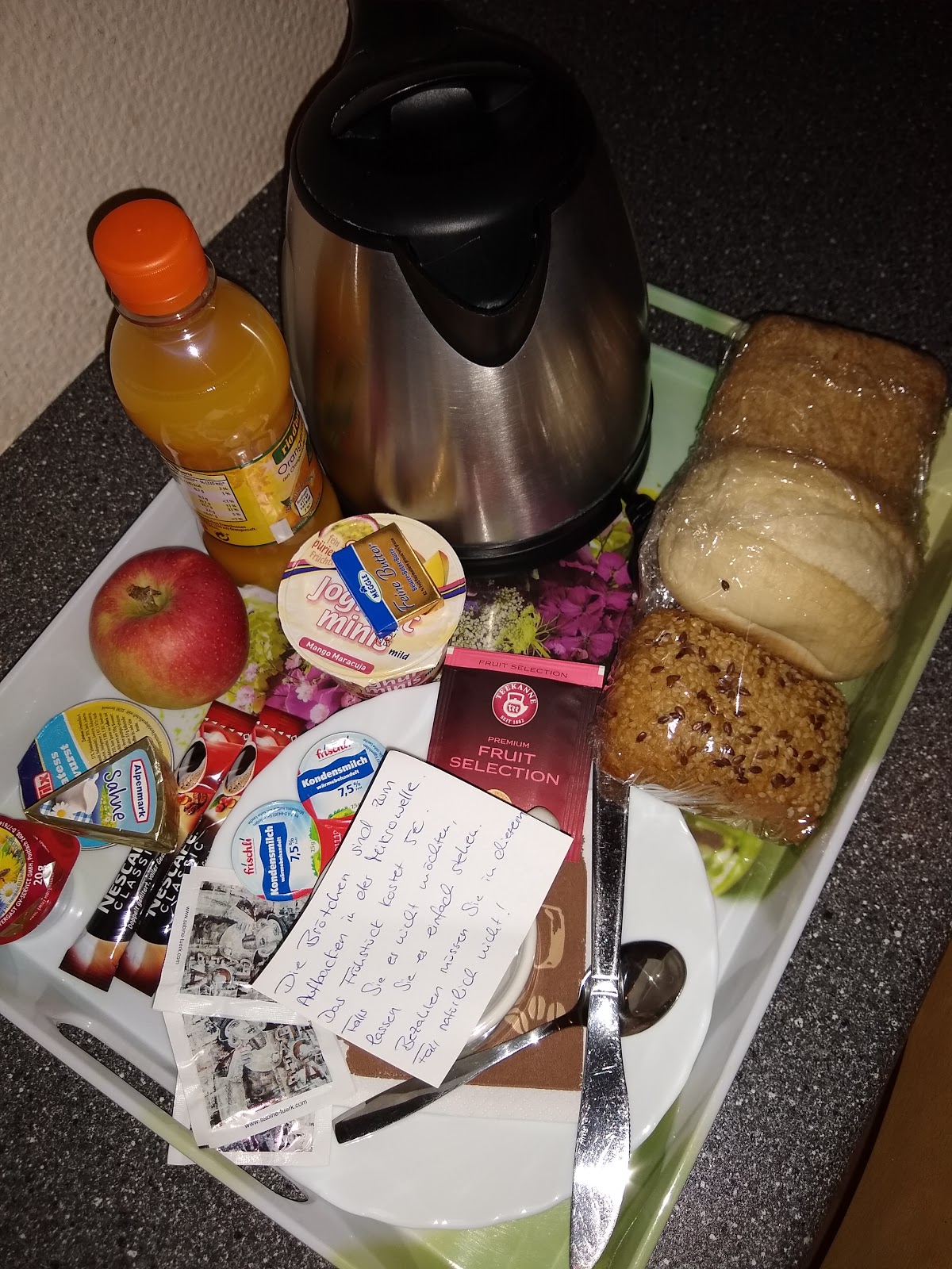Im Zimmer angekommen überraschte mich das Frühstück. Etwas seltsam war es schon, dass alles so vorbereitet war. Mein Fall ist das nicht und so war ich froh, dass ich mich für den Folgetag bereits zum Frühstück verabredet hatte. Das Frühstück war komplett in Platik verpackt auf einem Tablett im Zimmer stehend. Die Brötchen sollte ich in einer Mikrowelle selbst aufbacken.