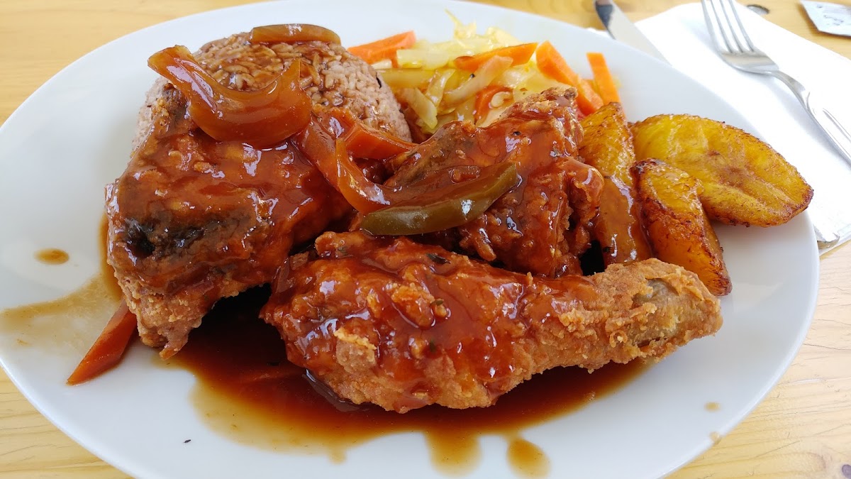 I went on a Saturday with my husband. We saw the open sign at 11:30AM, so we decided to walk in. You can't miss this small place (almost like a shack) because of its bright colors. We were the only ones there (of course, it was quite early). Due to fasting, we were ordering food for dinner. My husband ordered the jerk chicken, and I ordered the fish, which seemed to be a Saturday special. It looks like they have a special dish each day. They take credit card. There is space to sit indoors, but it is not an abundance of seating. We parked on the street.