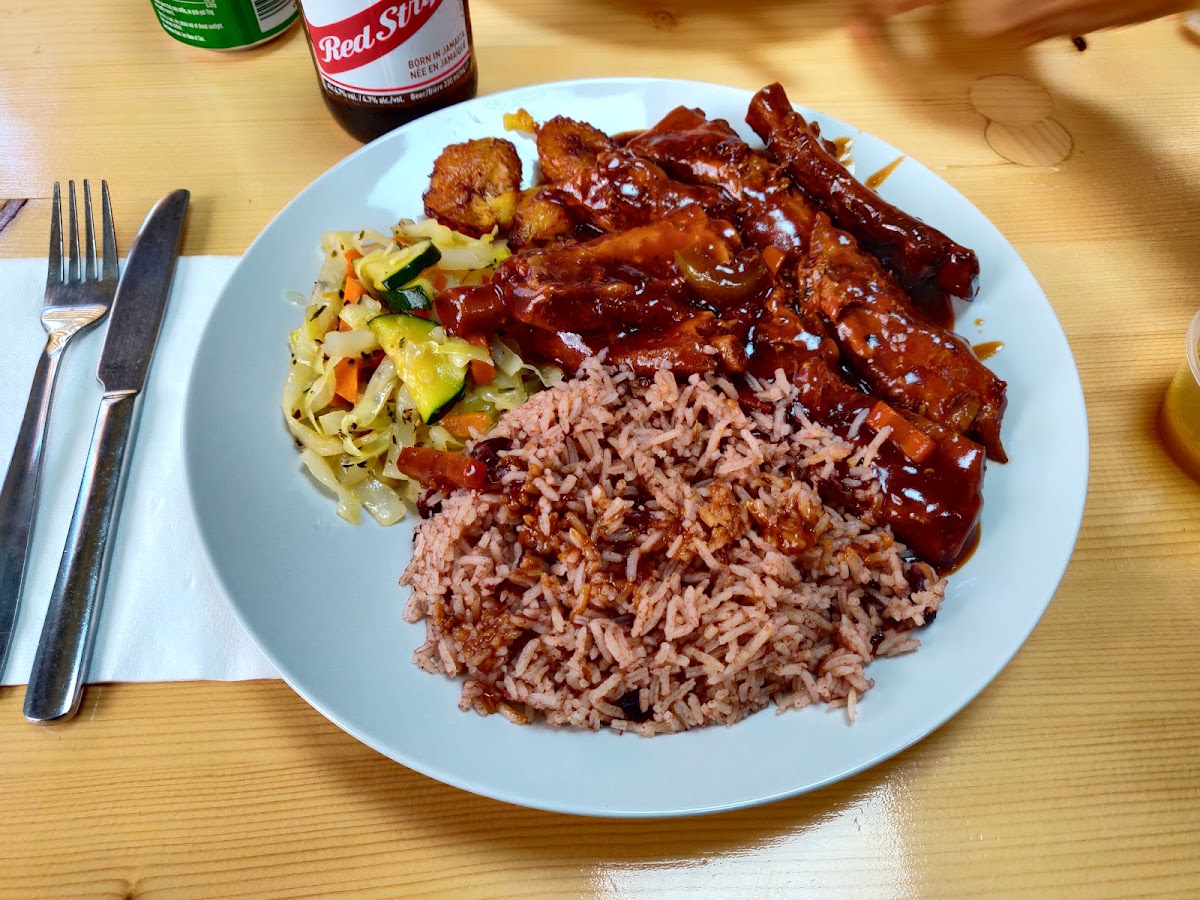 Later that night, we were able to reheat our food in the oven in the to-go foil containers. The food was plentiful! This was my first time trying Jamaican food, and, I have to say, this was the most flavorful food I have had in Stuttgart. It was definitely very flavorful and a little spicy. The only issue for me was that the fish had A LOT of bones. It was not fun trying to get through the bones. The fish was mixed with okra, carrots, and onions and everything was marinated with flavor. It also came with a side of rice, plantains, and (salad?) cabbage/sliced carrots, which were ok. My husband seemed to enjoy the jerk chicken, but not sure how good it was compared to other ones he has had.