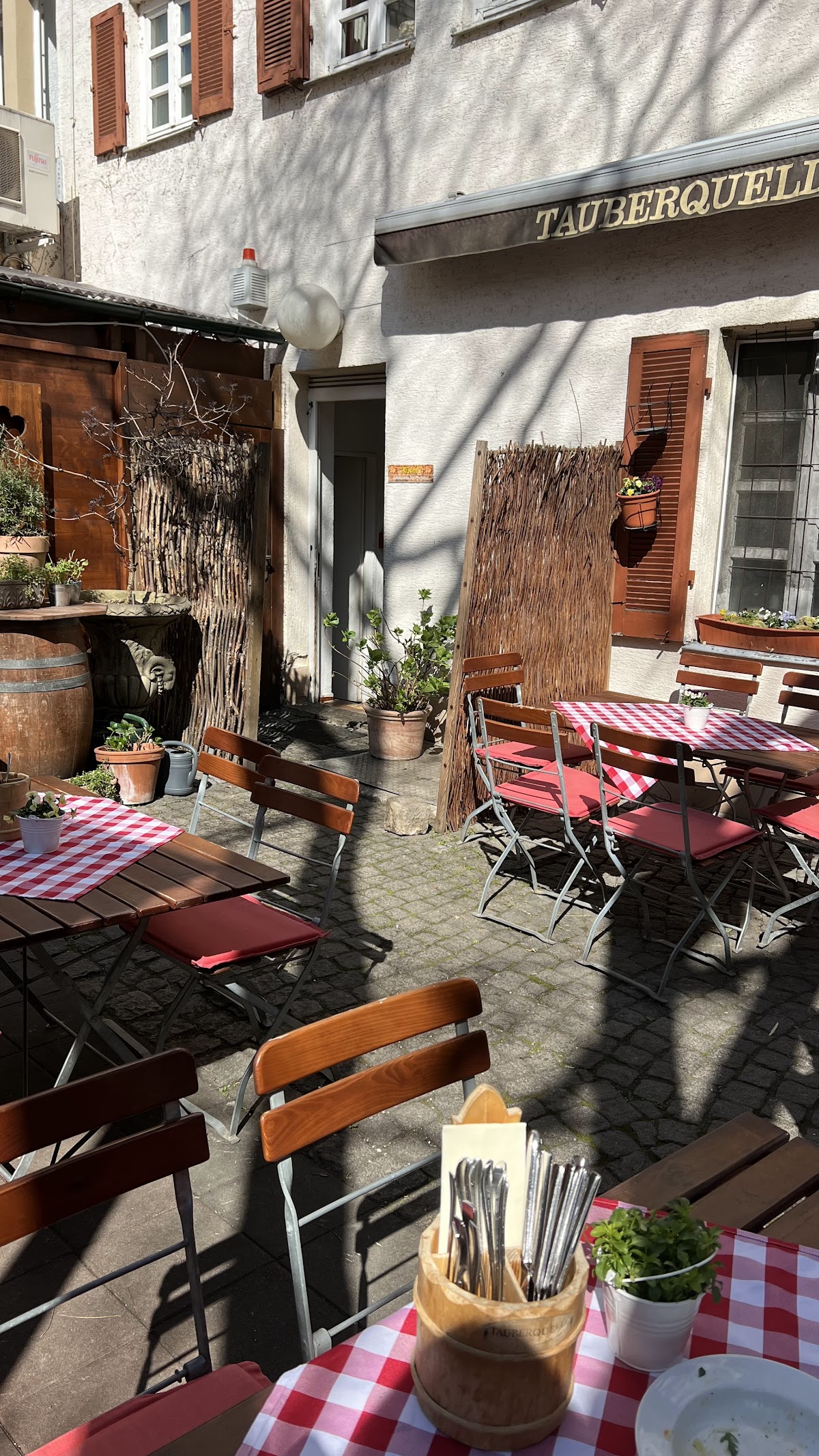 Full of character. Great service and really good food. And the white wine was superb. English and German menus available. Tourist friendly yet full of locals. Great experience and would definitely return for another bottle of white in the biergarten. Beautiful experience.