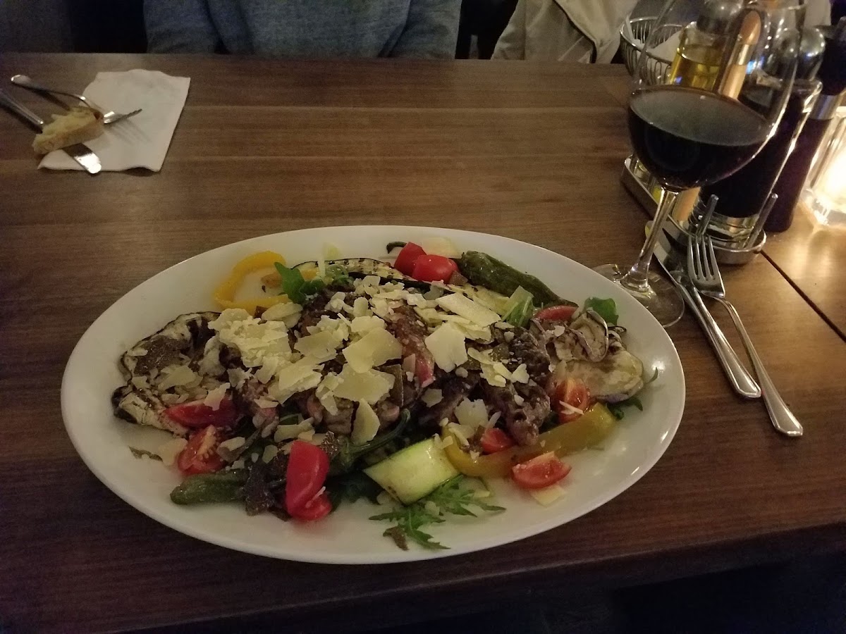 Ok. Atmosphere was dark and spacious. Food was well prepared but not special. Service was not great. Our waiter couldn't describe the menu (in any language) and was generally unhelpful and uncaring. Prices above average but not justified by the food. Wines by glass were limited but fine actually. Only accepts german cards. Would not try again.