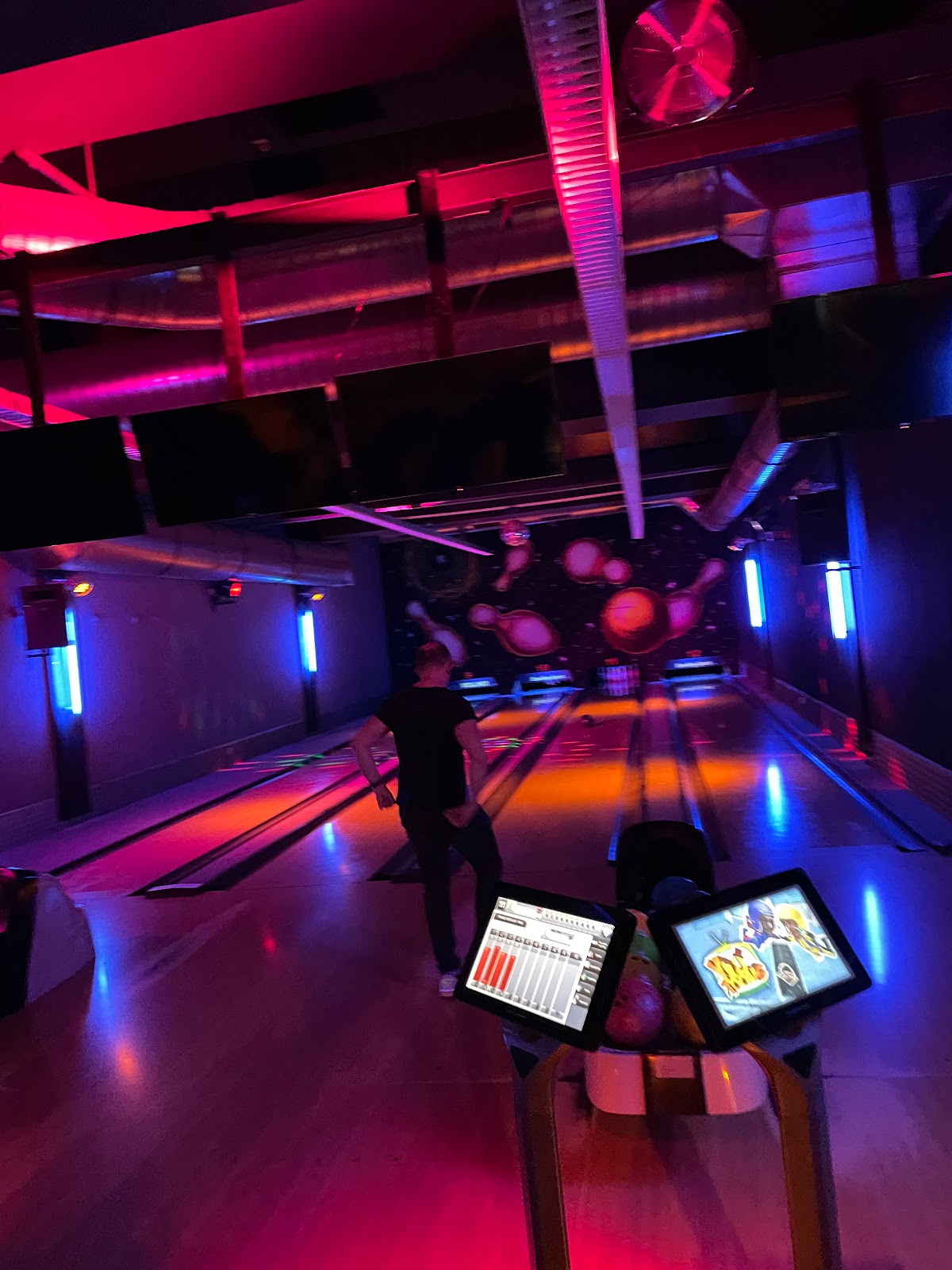 Die Bowling Bahn war technisch TOP und mit lustigen Spielen versehen. der Platz ausreichend, die Schuhe sauer und desinfiziert, Kugeln ebenfalls ausreichend aber nur EIN Kellner? Da hat schon mal lange gedauert mit den Drinks, kein Wunder aber trotz dem Stress den der arme Kerl hatte, war er immer sehr zuvorkommend und freundlich zu jedem Zeitpunkt ????????????????????????