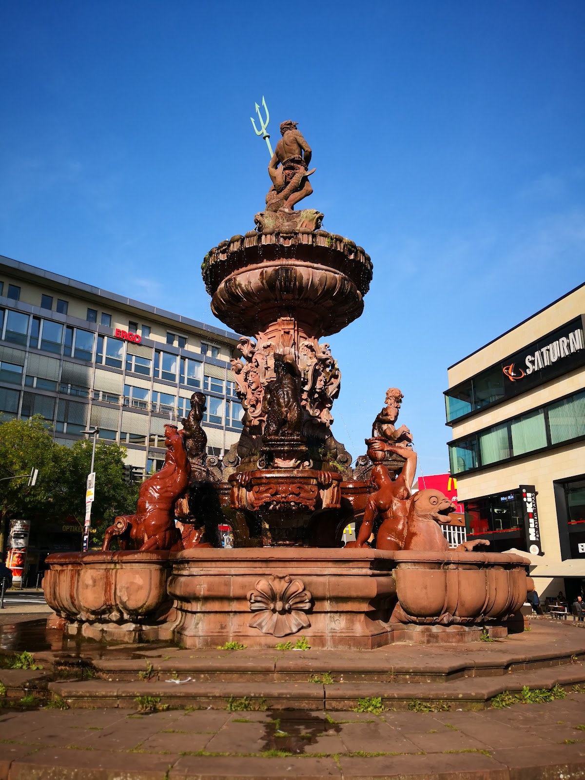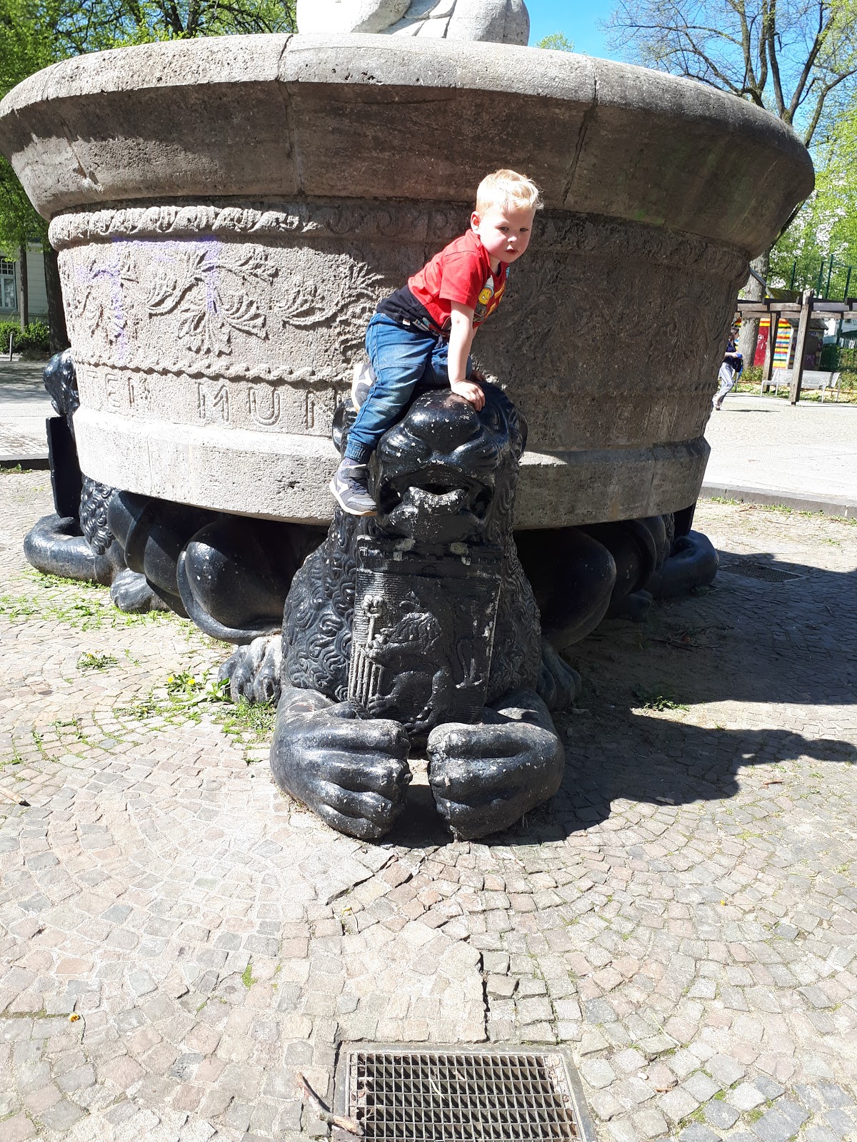 Ein schöner Spielplatz, unterteilt in zwei Bereichen. Kleinkinder und für große, ein Fußball Bereich gibt's auch, der sehr gut besucht ist. Sitzplätze gibt's ausreichend. Der Brunnen ist ganz schön anzusehen, öfters auch mal das Wasser an an Gerechtigkeitbrunben. Gegenüber Ist eine klasse Eisdiele sehr zum empfehlen. Ein pennymarkt ist auch direkt um die Ecke.